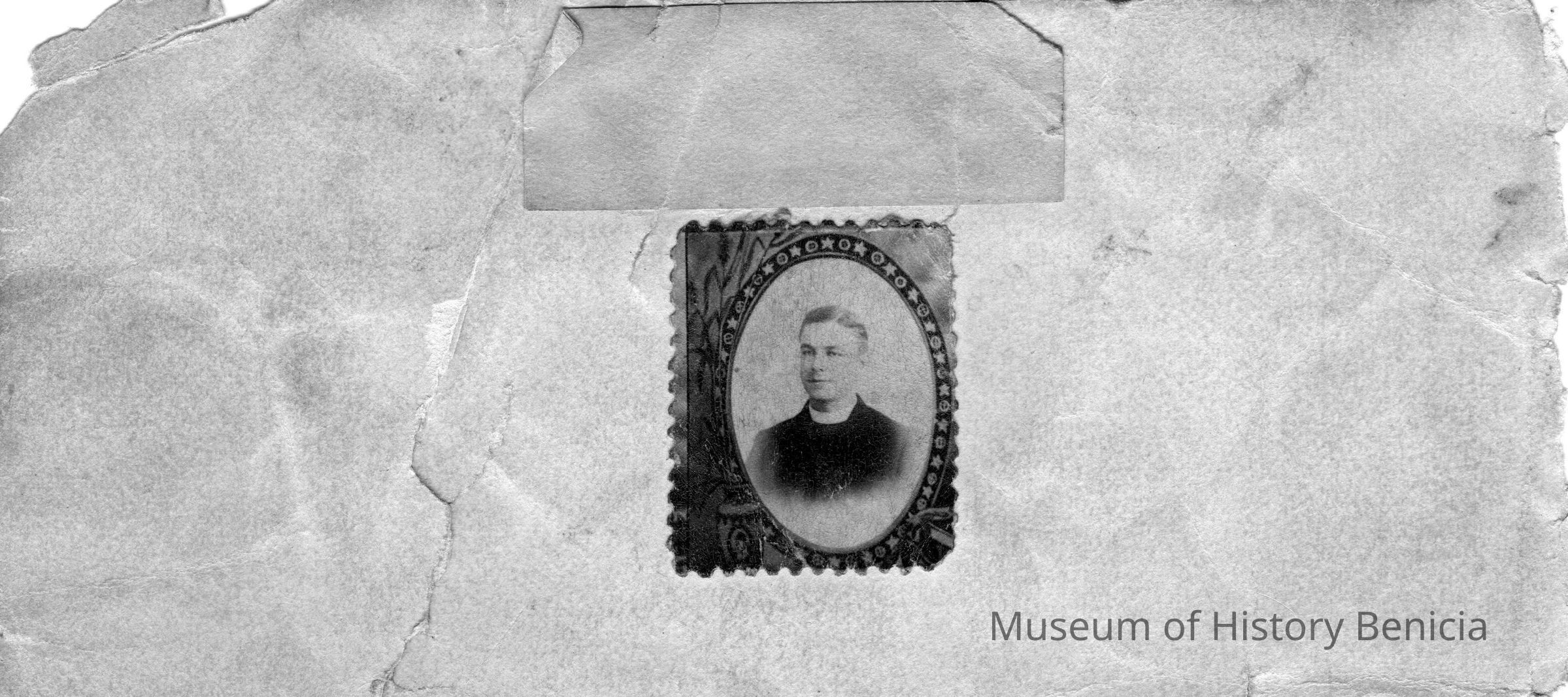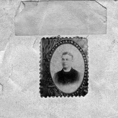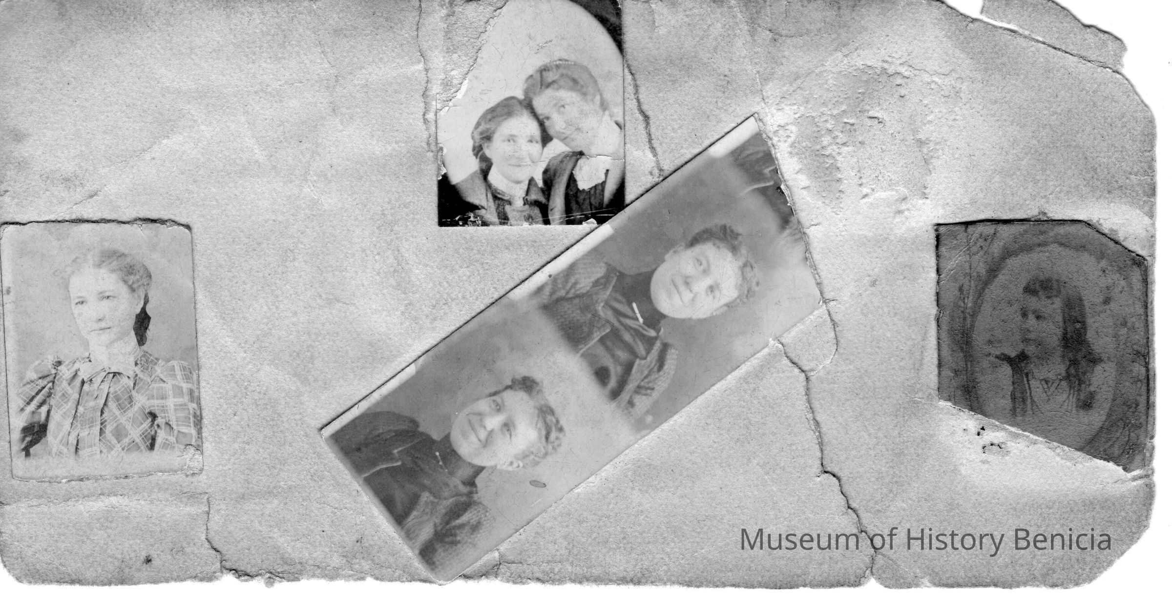 Photo of people. Photos are on small 1" square photos attached to what was a small photo album. The pages are 5" x 2.25".