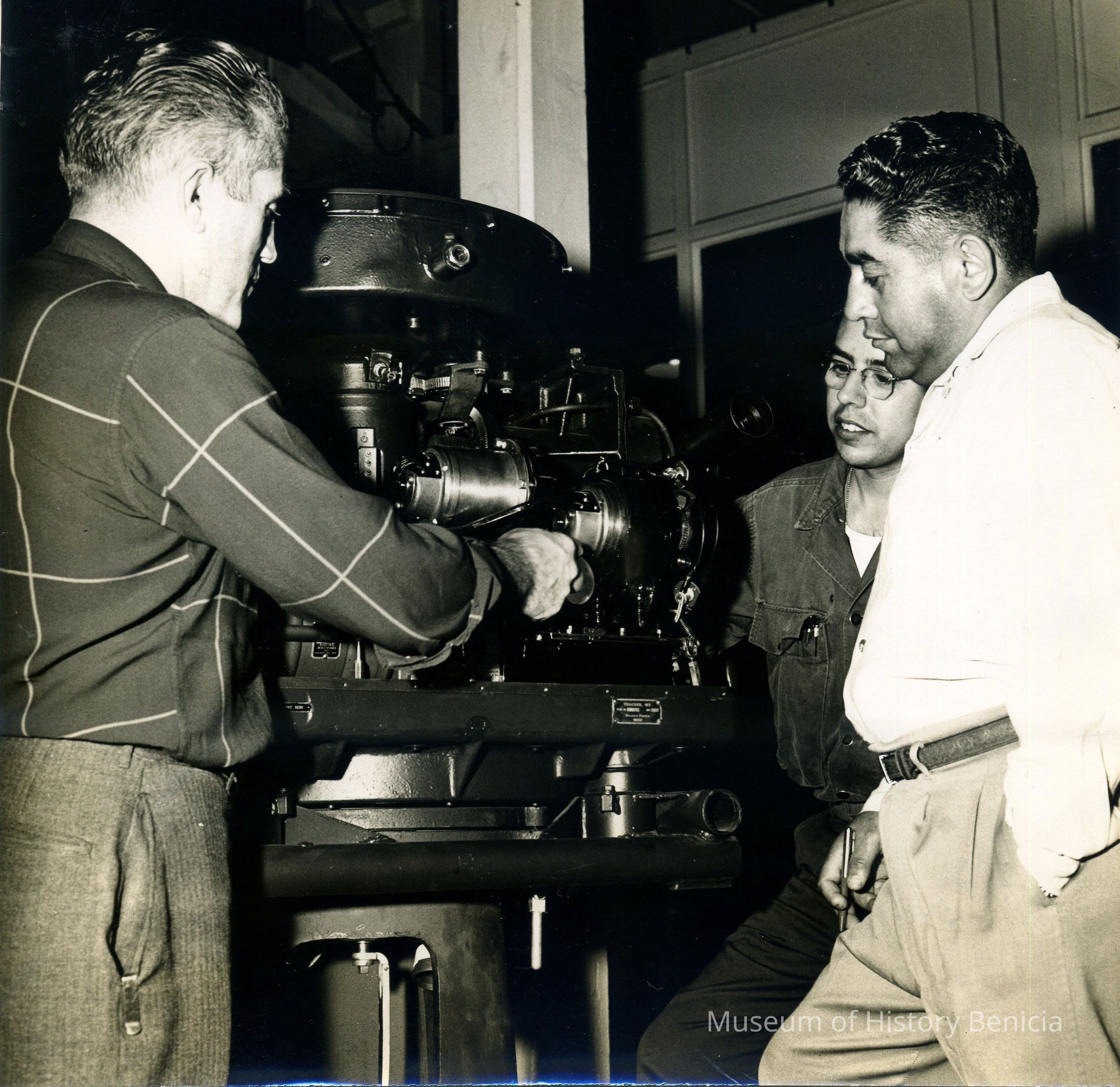 B/W Photograph - Mr. Richard Habeger gives pointers to Alexander Campas and Henry Sanchez in regards to a tracker for anti-aircraft guns at a Benicia Arsenal Fire Control School class in the early 1950's 8" x 7-3/4"
