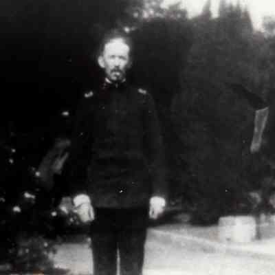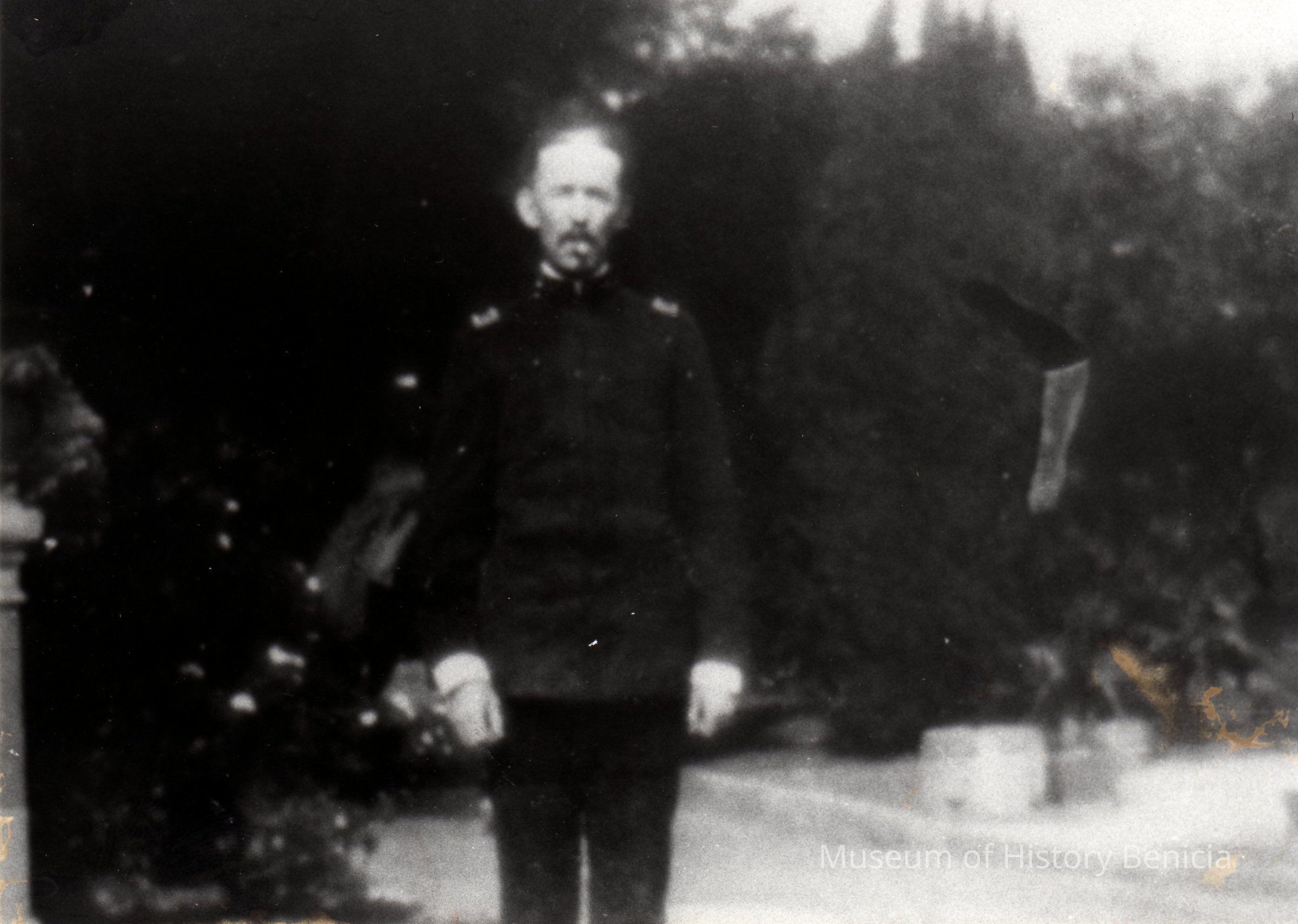 B/W photograph in an album of Col. James Benet near front of the Commanding Officer's Quarters. (Commandant's Residence)