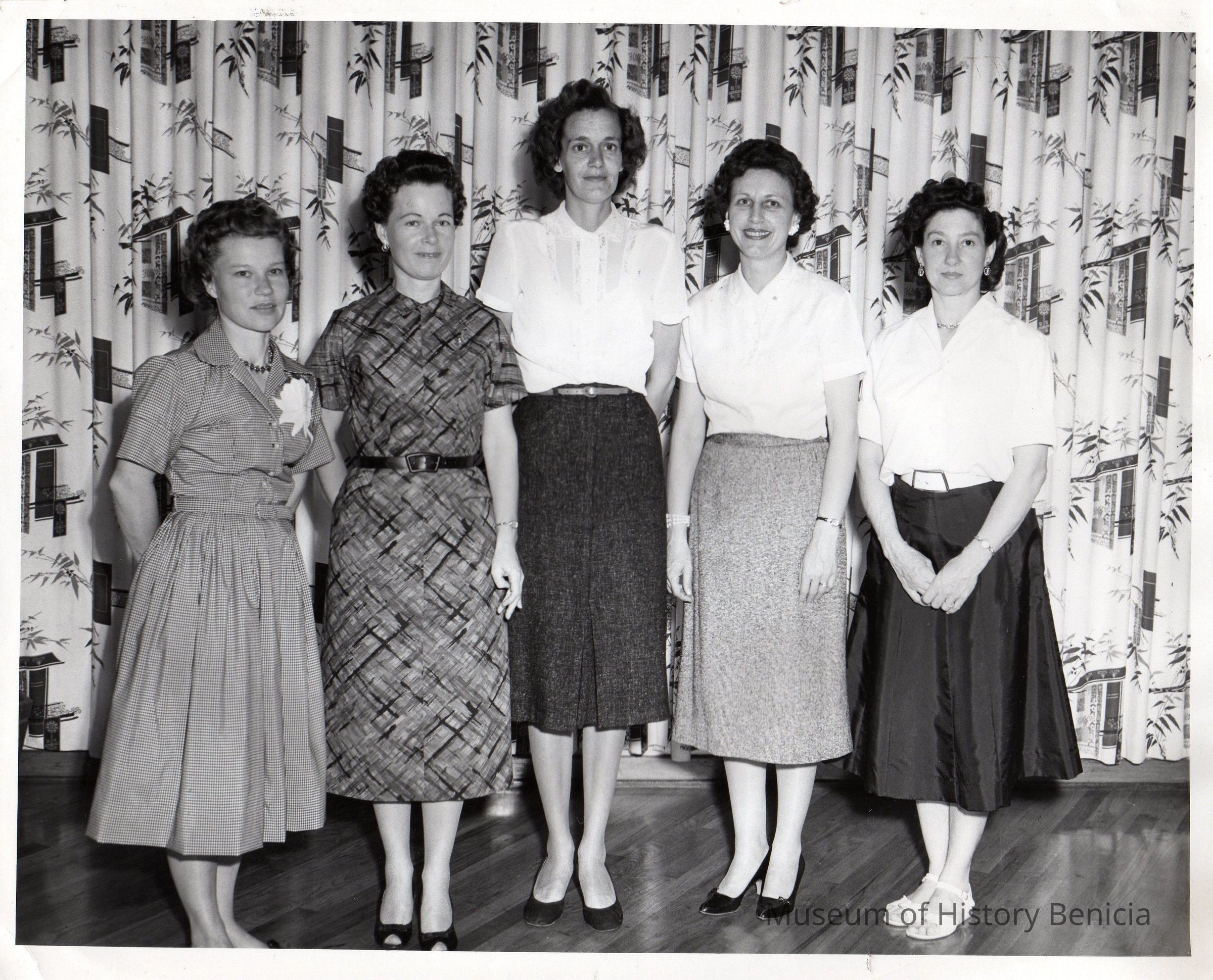 B/W Five women standing in front of a curtain.