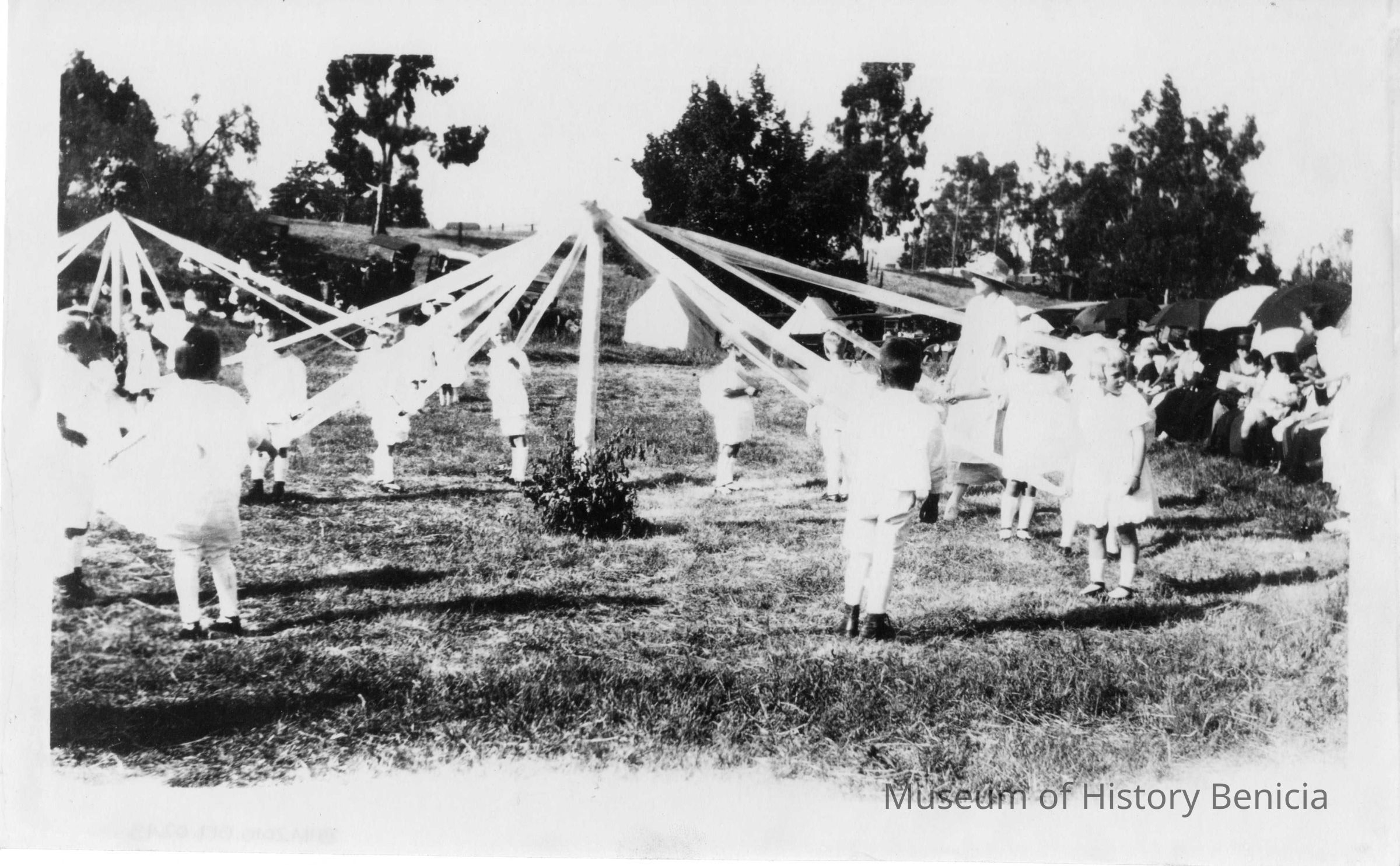 Photograph of a Maypole celebration. Photo has very bad contrast, difficult to make out details. Several children around a pole holding ribbons, one woman watching over them. People with parasols are watching on the side. Another Maypole with children in are in the background.Collection