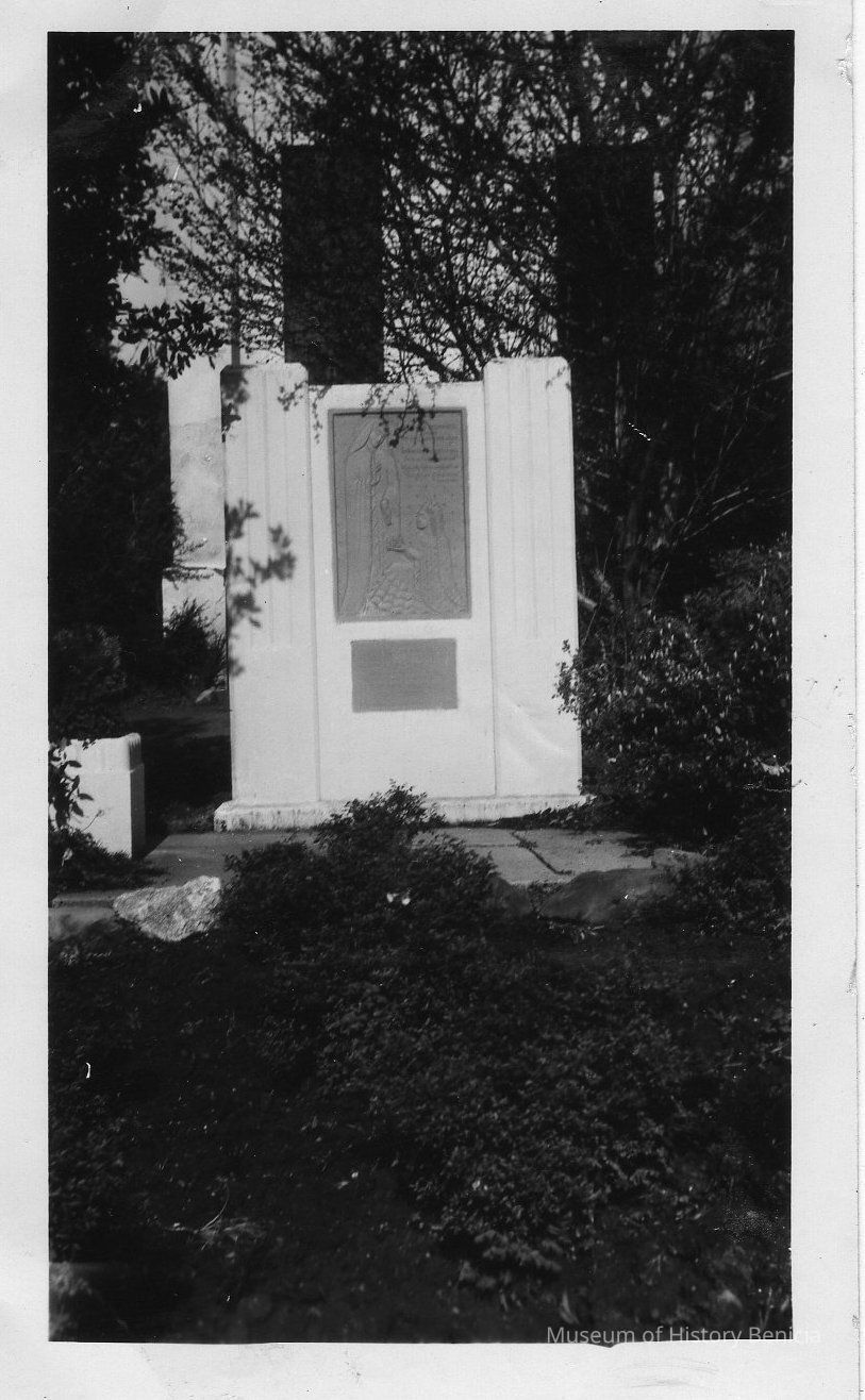 B/W photograph: Sister Dominica marker. Per back of photograph: Concepcion Arguello (Sister Dominica) Terra Cotta marker in Saint Catherin's Academy grounds. Dedicated by the Benicia Old Timers Committee in 1935.Collection