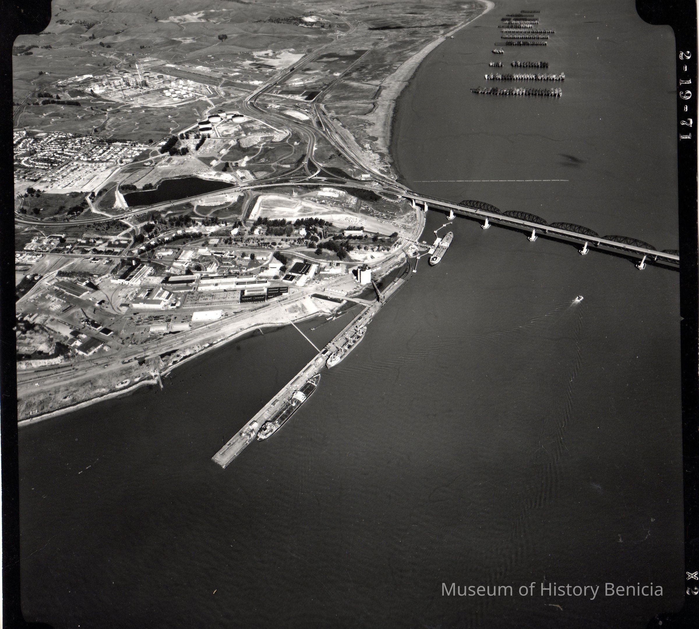 B/W aerial view of Arsenal, dock area, and mothball fleet, looking north.