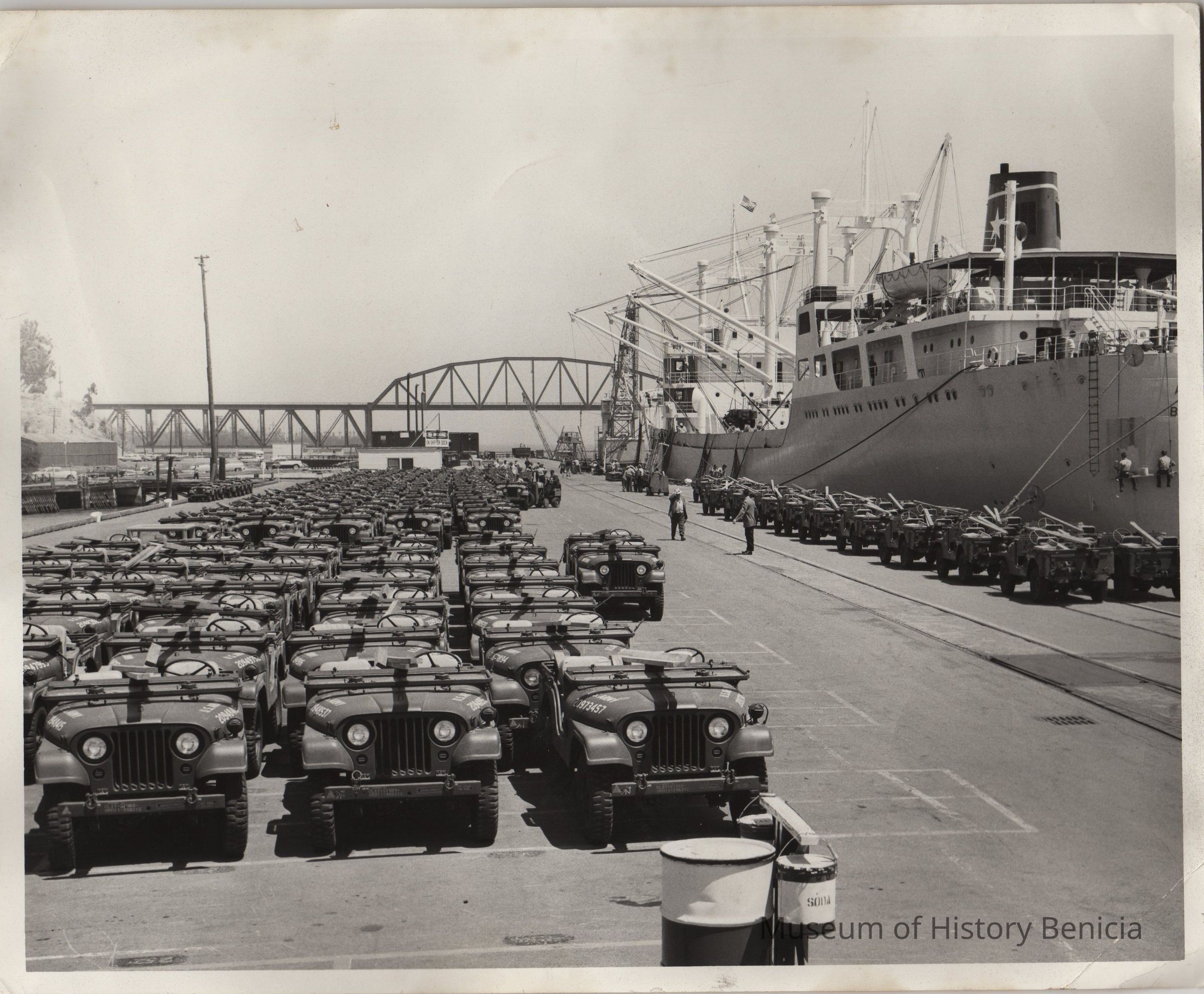 Black and white photo of jeeps being loaded aboard freighter at Benicia Arsenal Dock.