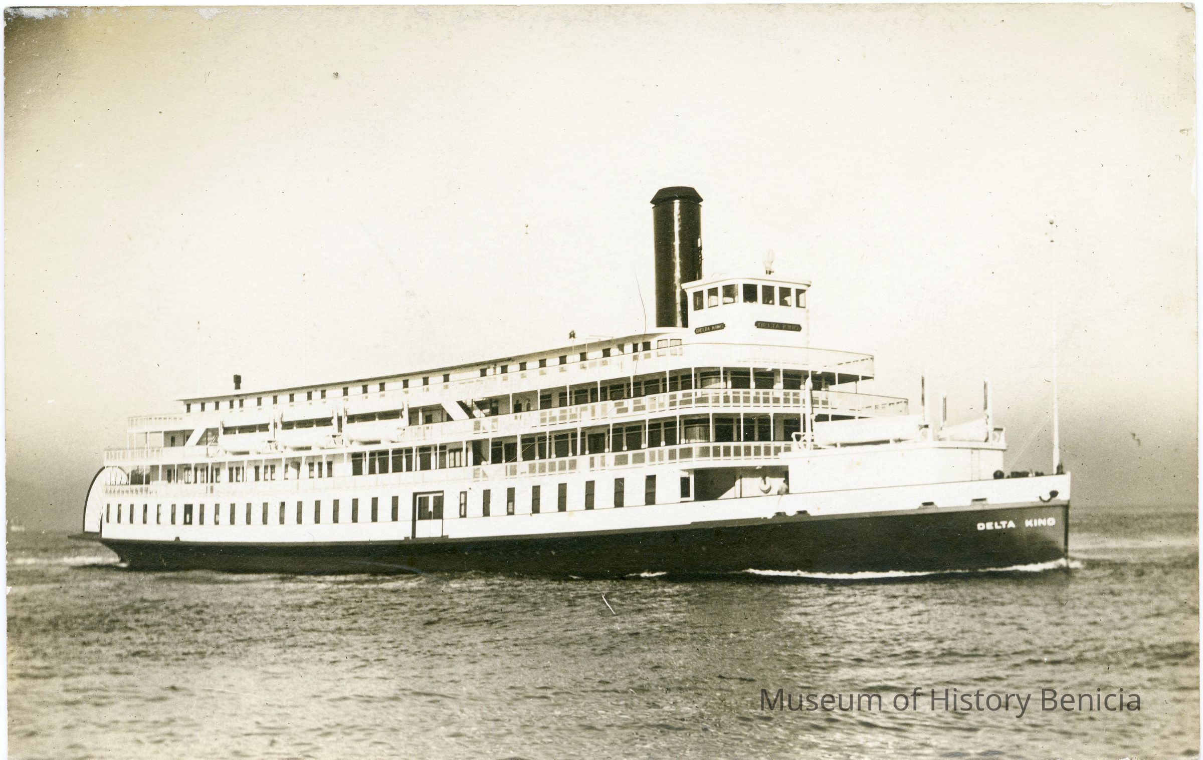 The photo is a picture of the Delta King ferryboat on the water.Collection
