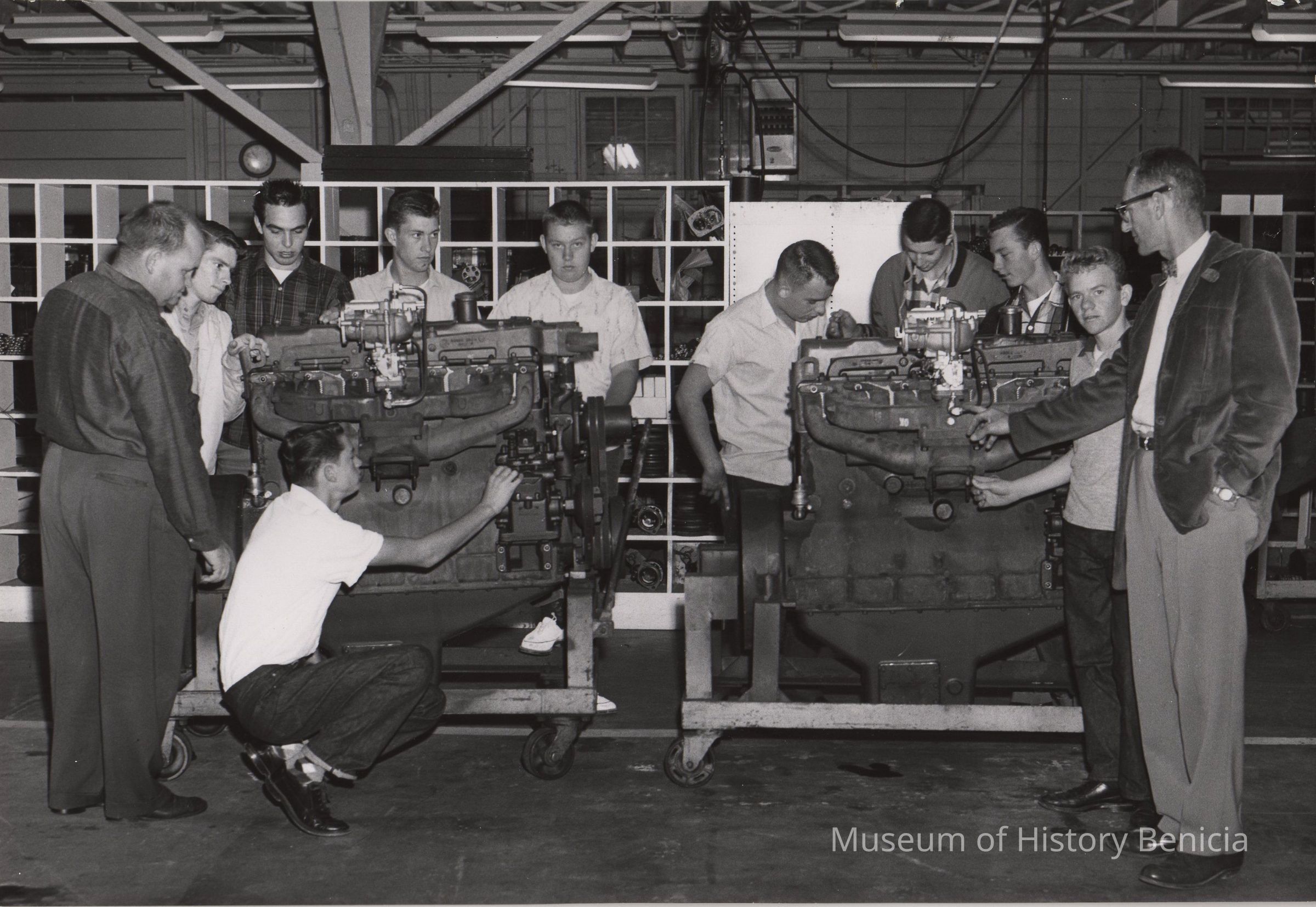 Engine rebuilding shop at Benicia Arsenal showing two rebuilt engines and 11 people inspecting the work. B/W photo. [this appears to be an auto shop class on a field trip, the auto shop teacher at Benicia High School, John Conway, is the man on the far left.]