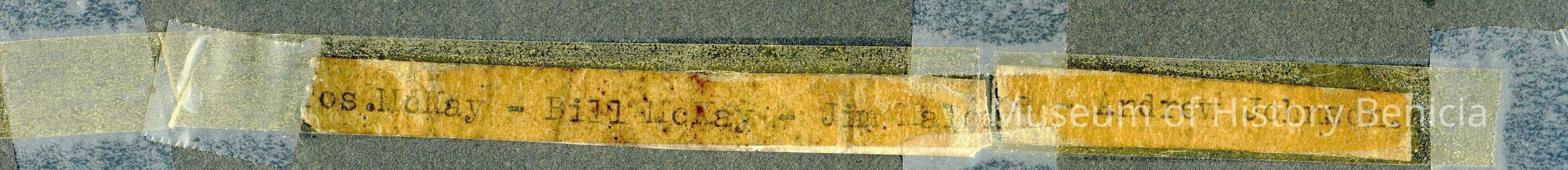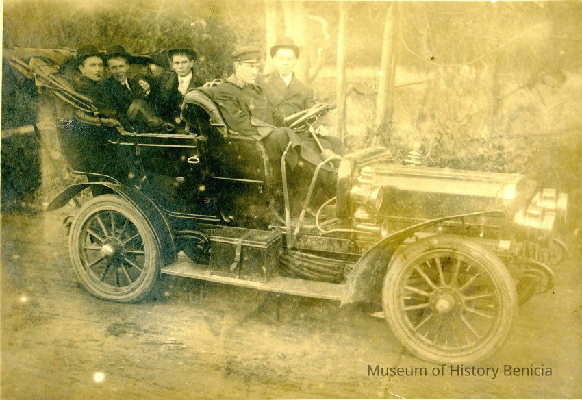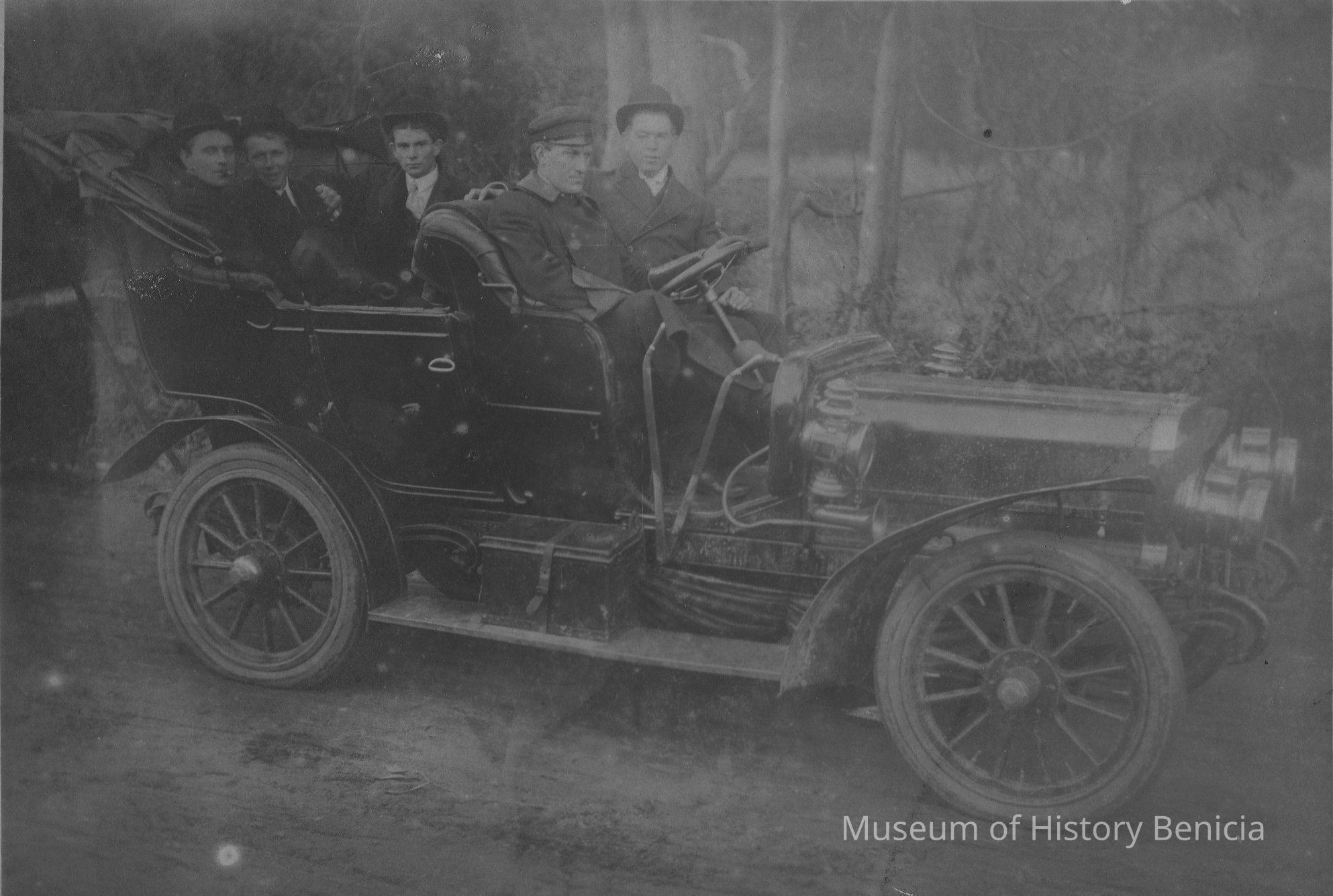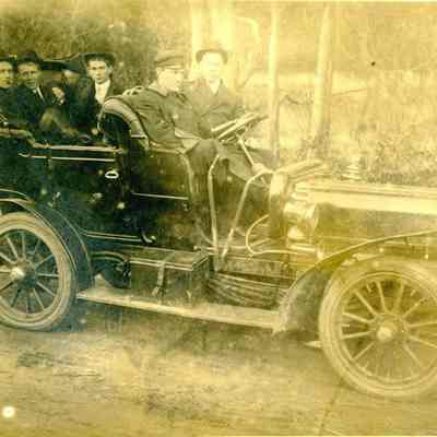 B/W photo of men in auto. Tom and Bill McKay in back seat; Jim Malone and Andrew Johnson in front seat. Man in uniform is not identified (perhaps he is a chauffeur).Collection