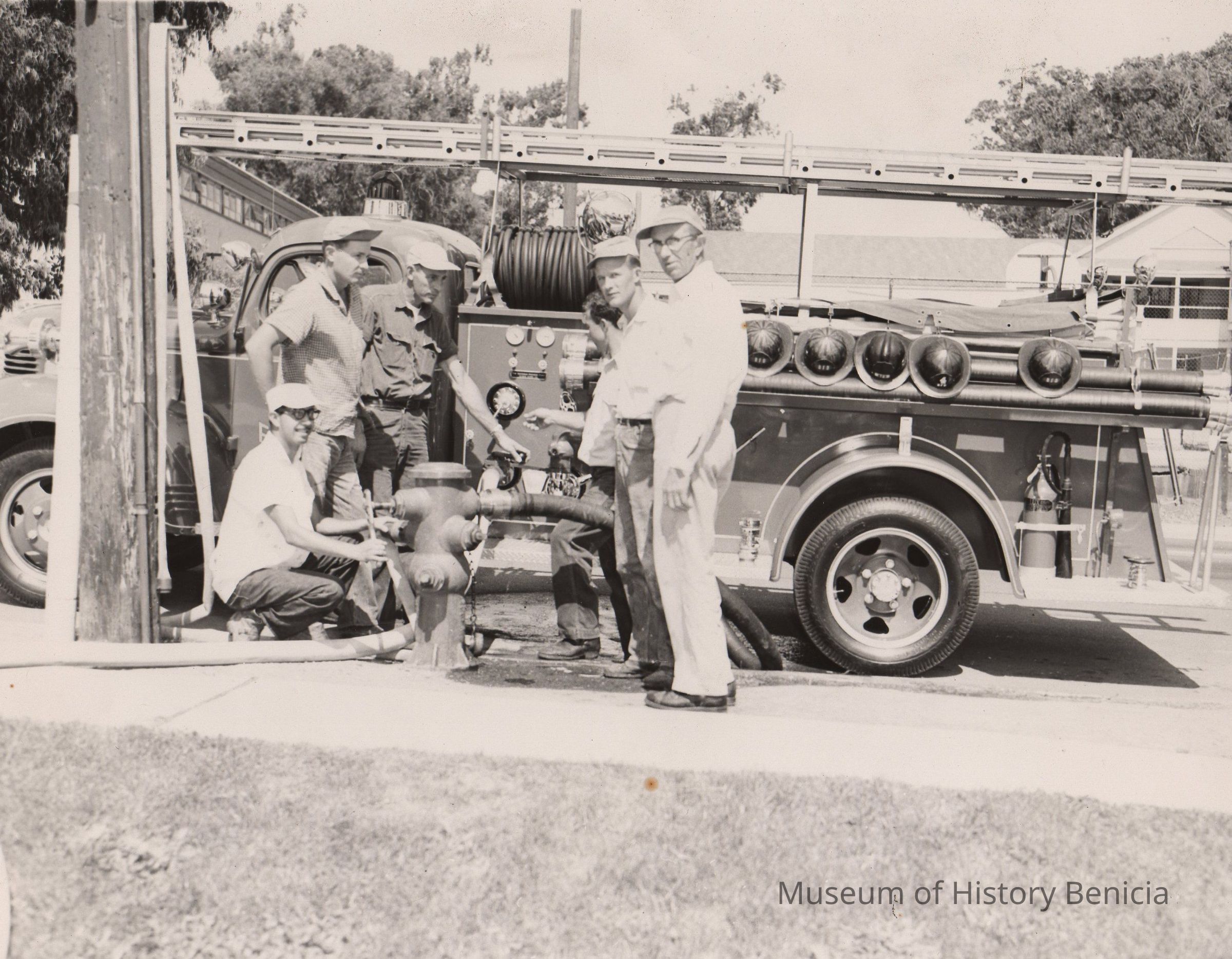 B/W photograph: Firemen posing at a hydrant and standing in front of the fire truck. Joe Cardenaz is squatting at the hydrant connection.