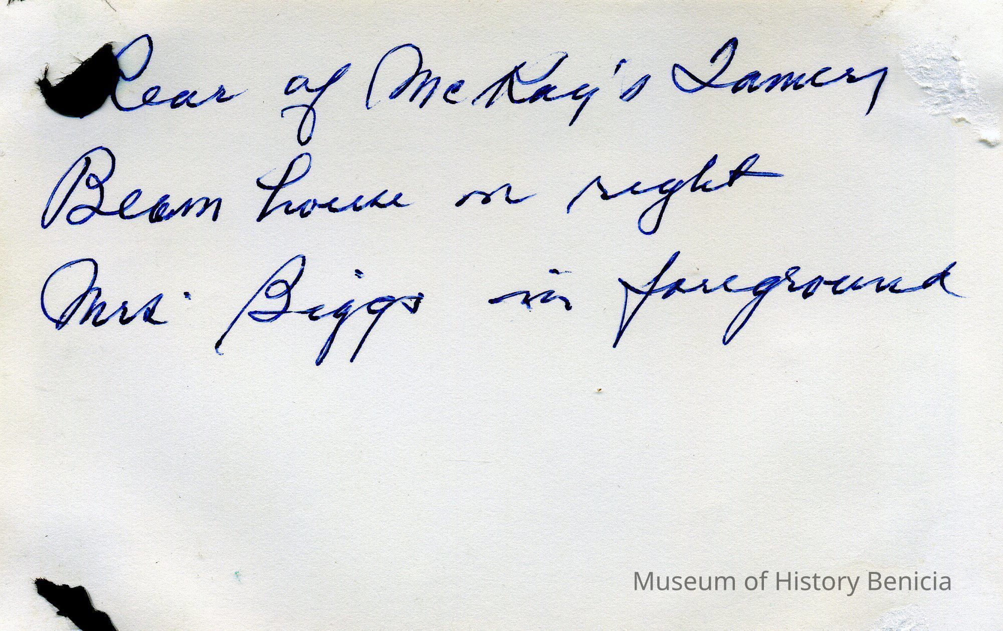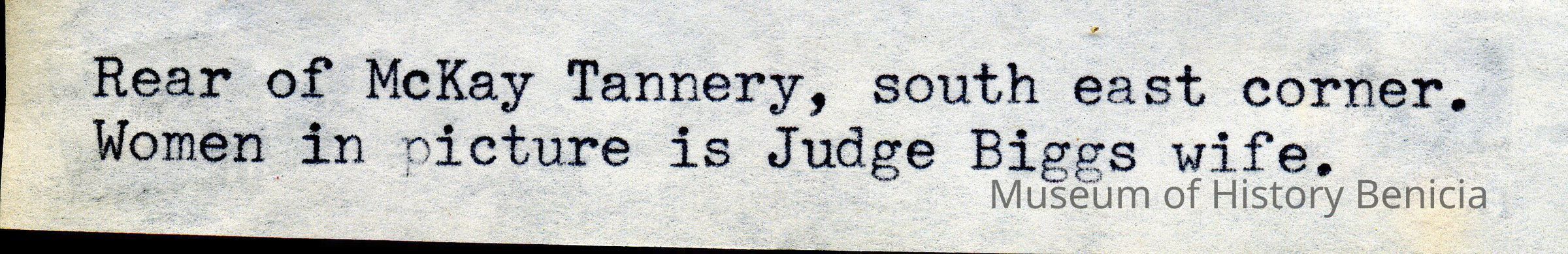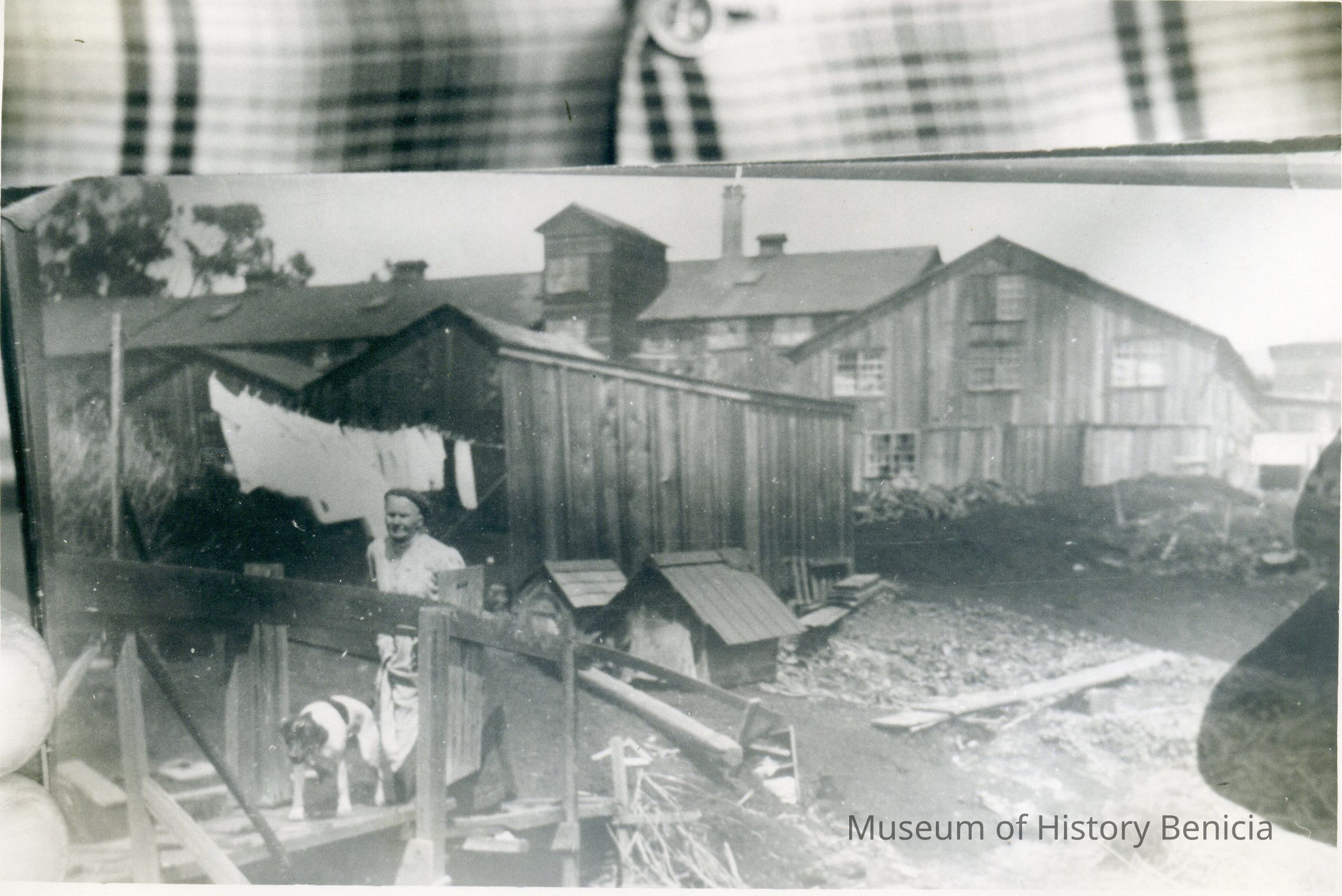 B/W photograph of the McKay Tannery in Benicia. Mrs Biggs is in the foreground and the Beam house is on the right.Collection