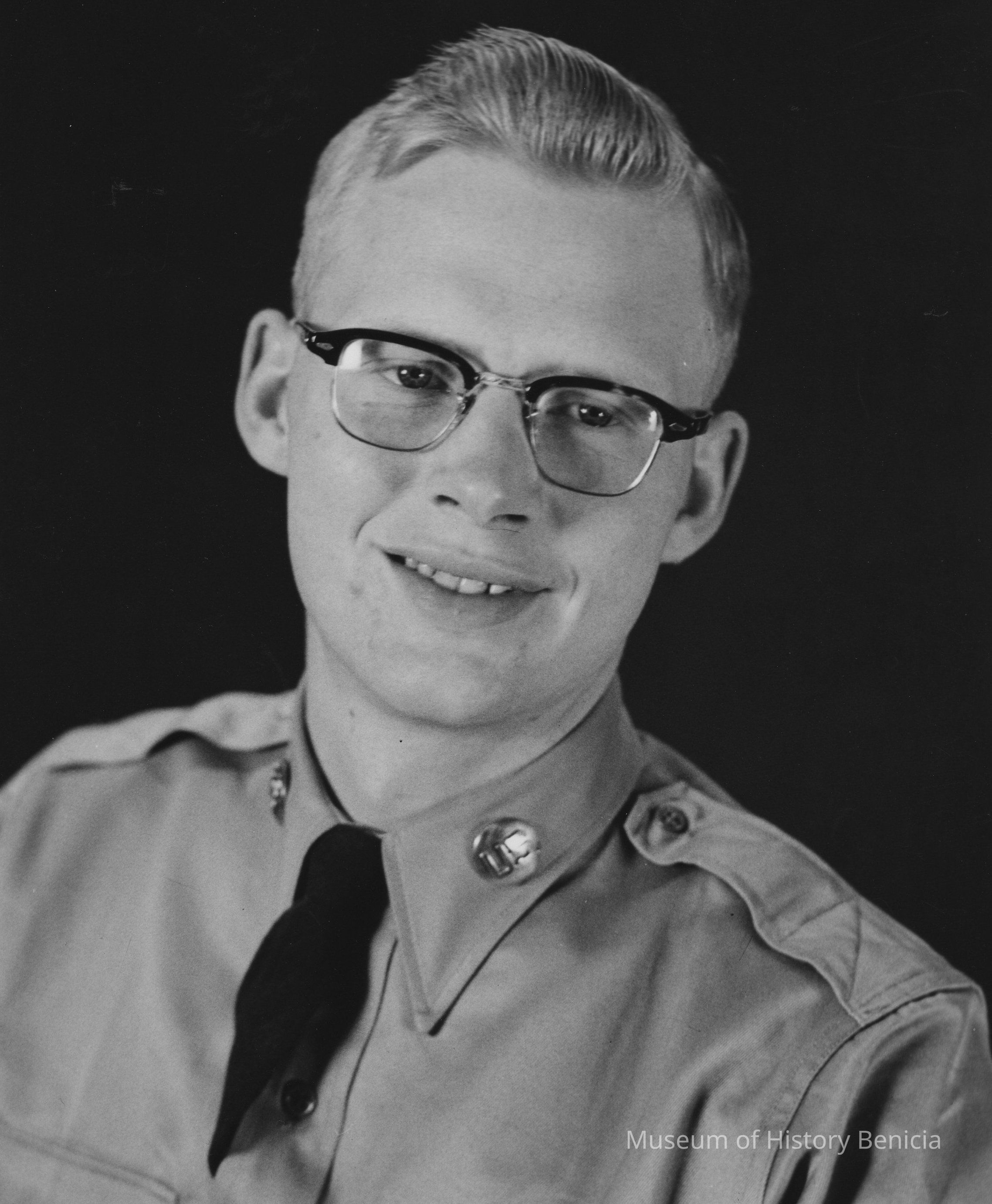 B/W photograph: Front bust view of young man with light hair, medium eyes and eyeglasses in uniform shirt. U.S. Army Photo Stamp on back and "Pvt. Newgard" in pencil. .Collection