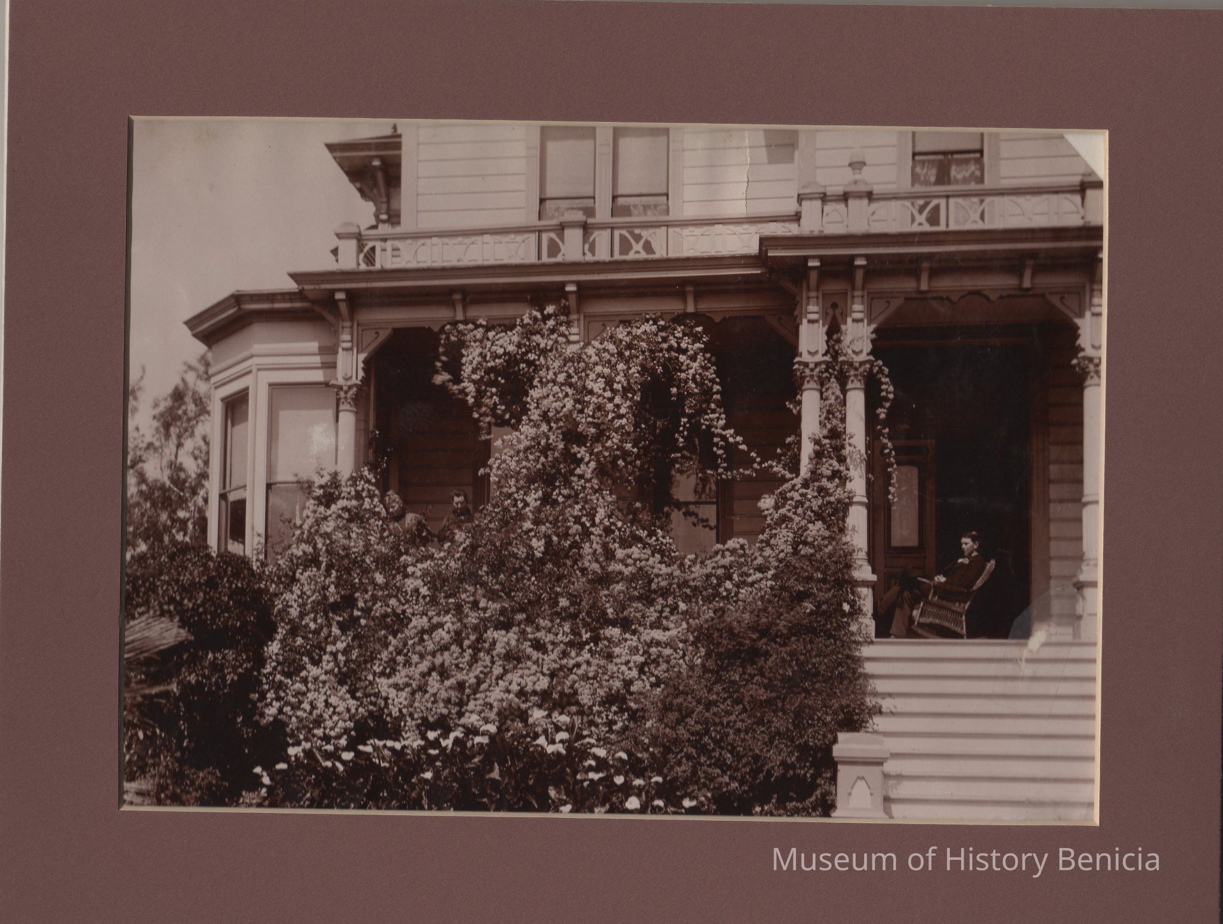 Black and white photo of Clay Goodyear in a rocking chair on the porch of the Goodyear home. The home was located at East Fifth and East O Streets. Clay was the son of Andrew Goodyear.Collection