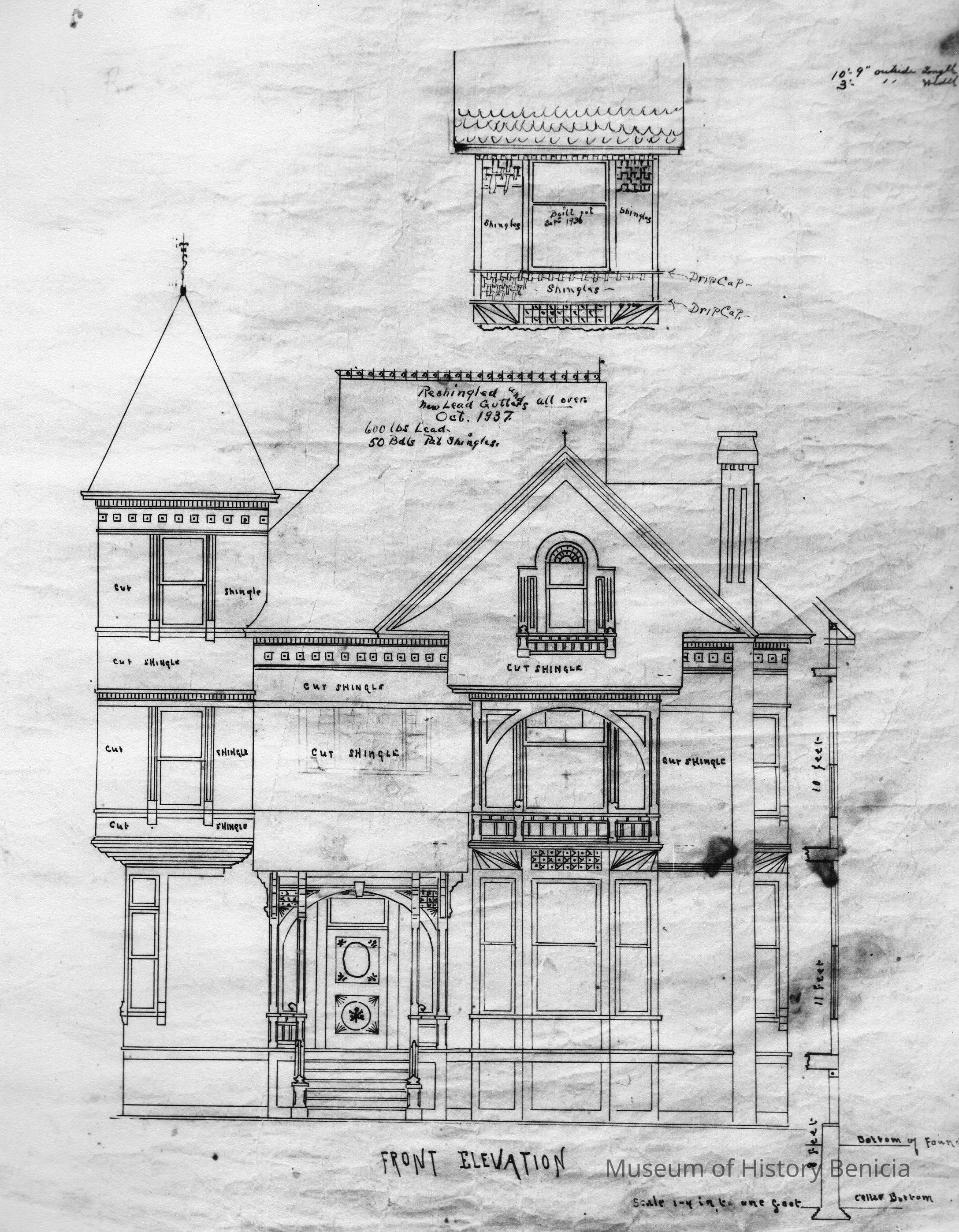 Front elevation of Riddell-Fish House. Drawing also shows some later alterations made to the house--e.g. "new lead gutters Oct. 1937." Appears as Figure 59 in Bruegmann book.Collection