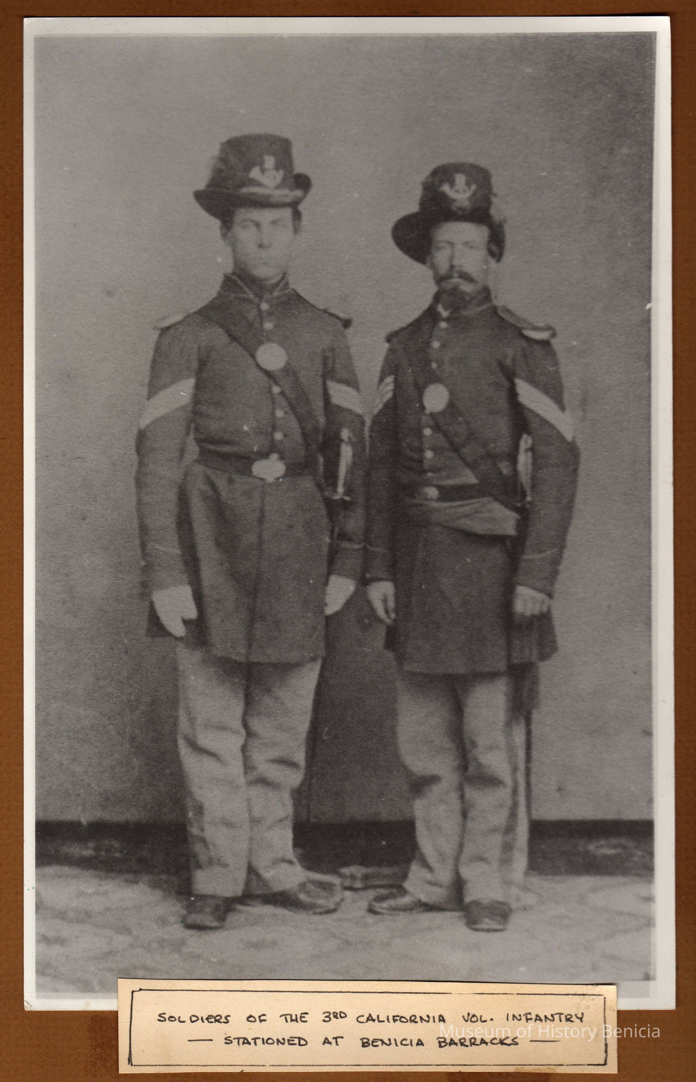 B/W Copy of a photograph, possibly from a transparancy slide, of two soldiers of the 3rd California Volunteer Infantry, who were stationed at the Benicia BarracksCollection