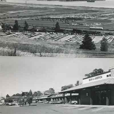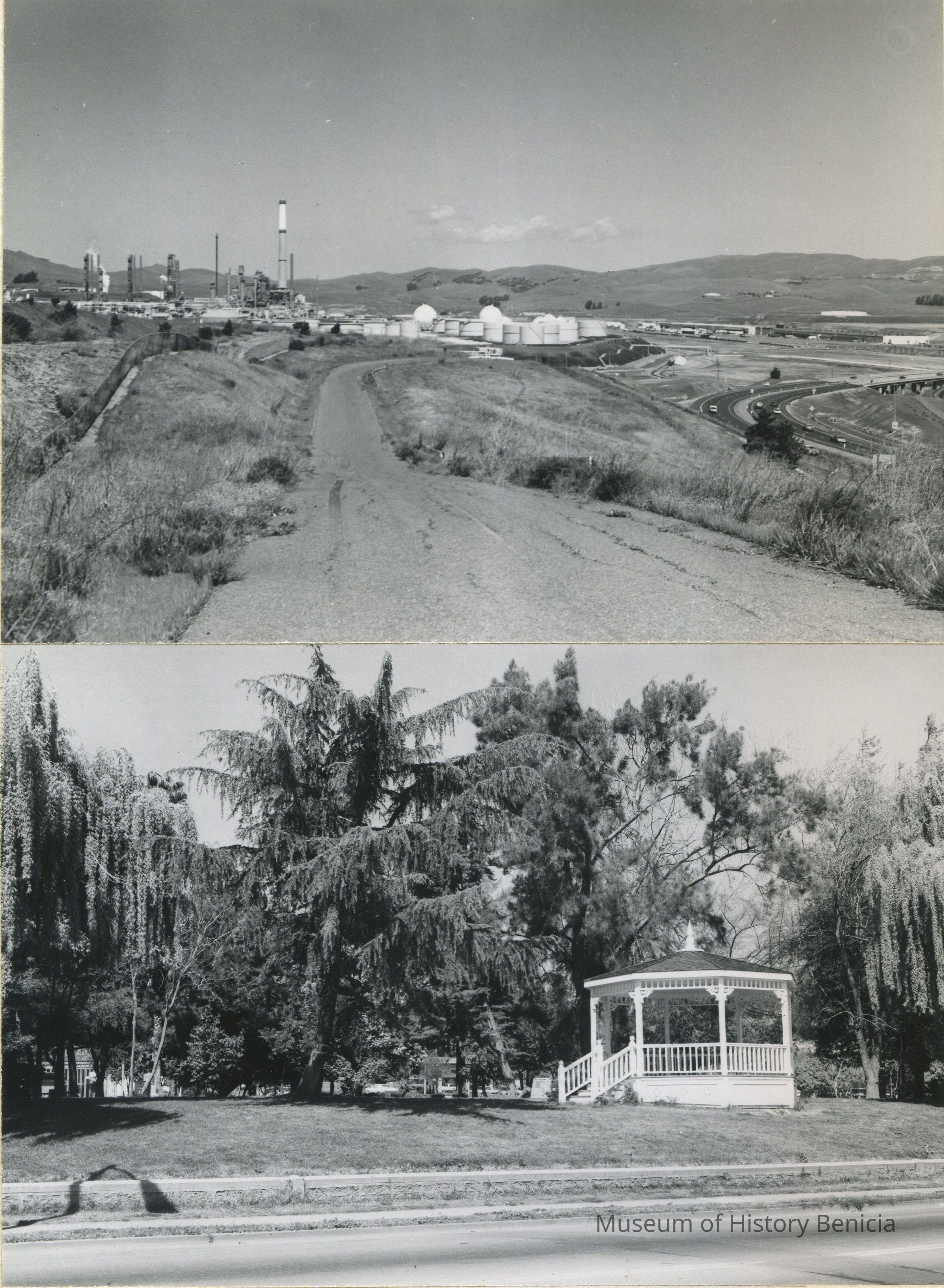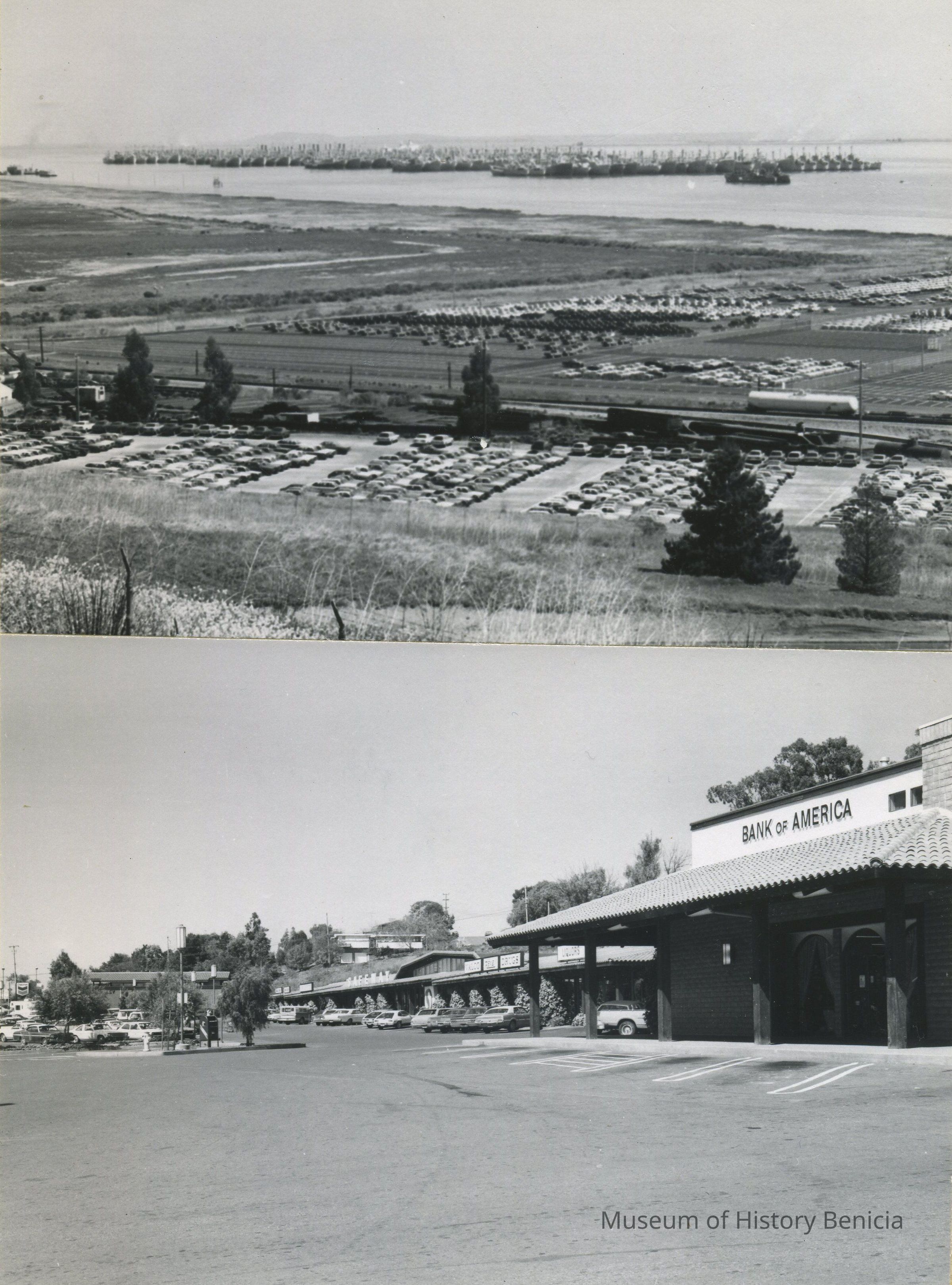 4 B/W photos originally under glass in a black frame with gold trim. The photographs are glued to a mat board. The caption (in two sections) reads: "The industry of Benicia includes oil refining and automobile assembly (the Mothball Fleet is in background), and there is a thriving market complex (where St. Catherine's Academy once stood). In the nearby park, the bandstand offers ghostly echos of "Seeing Nellie Home" and "You Were Sixteen." On hearing some of today's offerings, the horses hitched near- by would doubtless have torn from the hitching posts and gone whinnying madly down some street."Collection