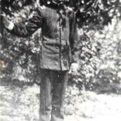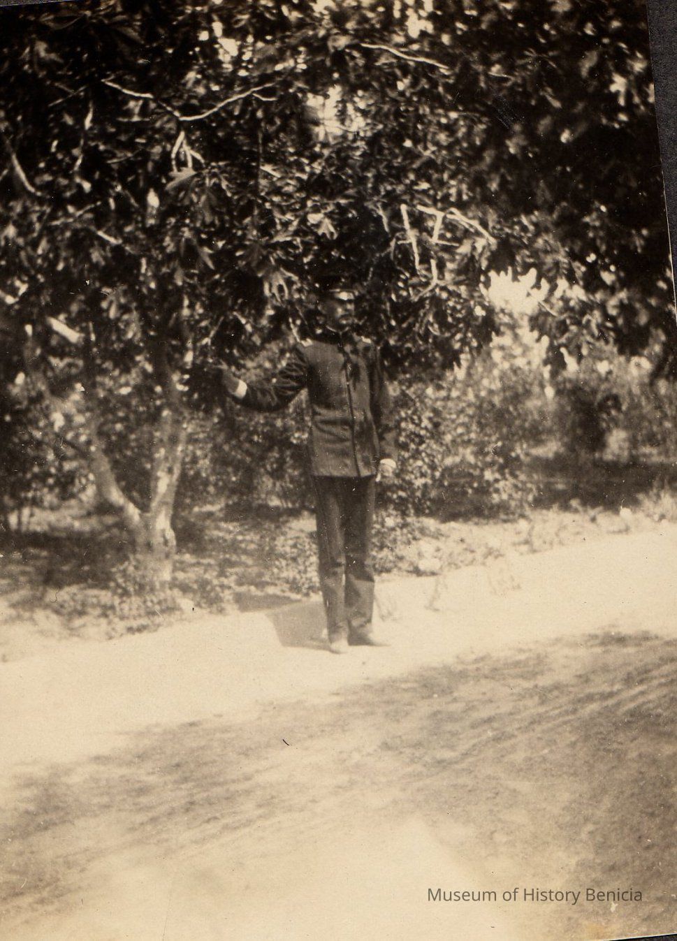 B/W photograph in an album of Col. James Benet by a road on the Arsenal grounds.