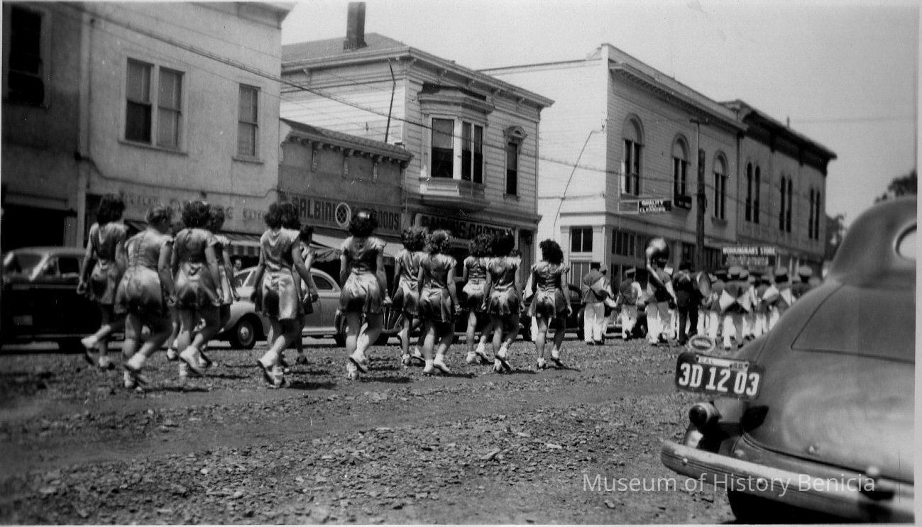 Black and white photo of parade on First Street between I and J Streets with Benicia High School band. note stores in background Balbini's, Rankin's Grocery, Tochterman's clothing.Collection