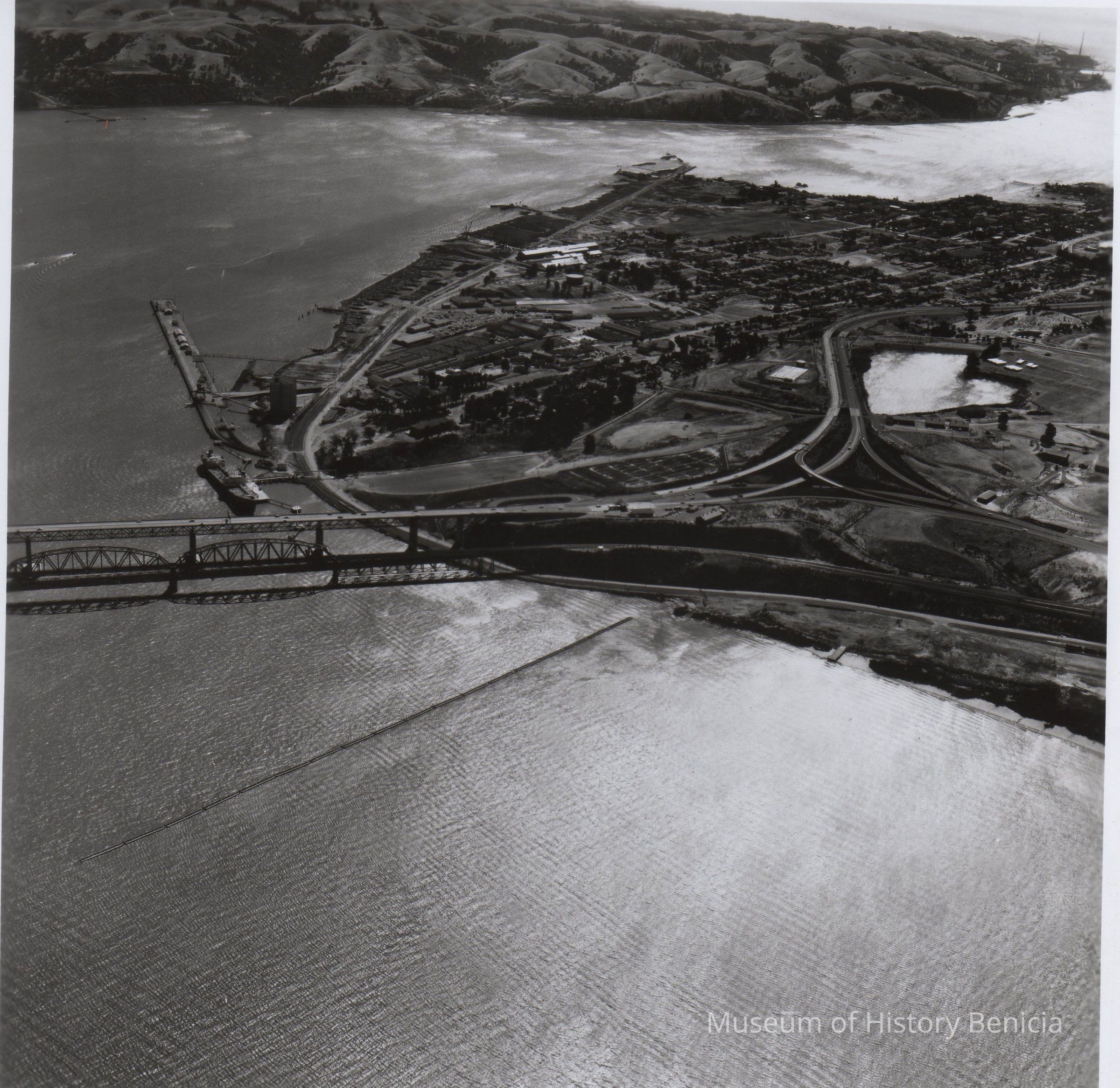 B/W aerial view of Benicia looking west, including bridges. Benicia-Martinez bridge in center.