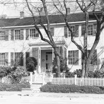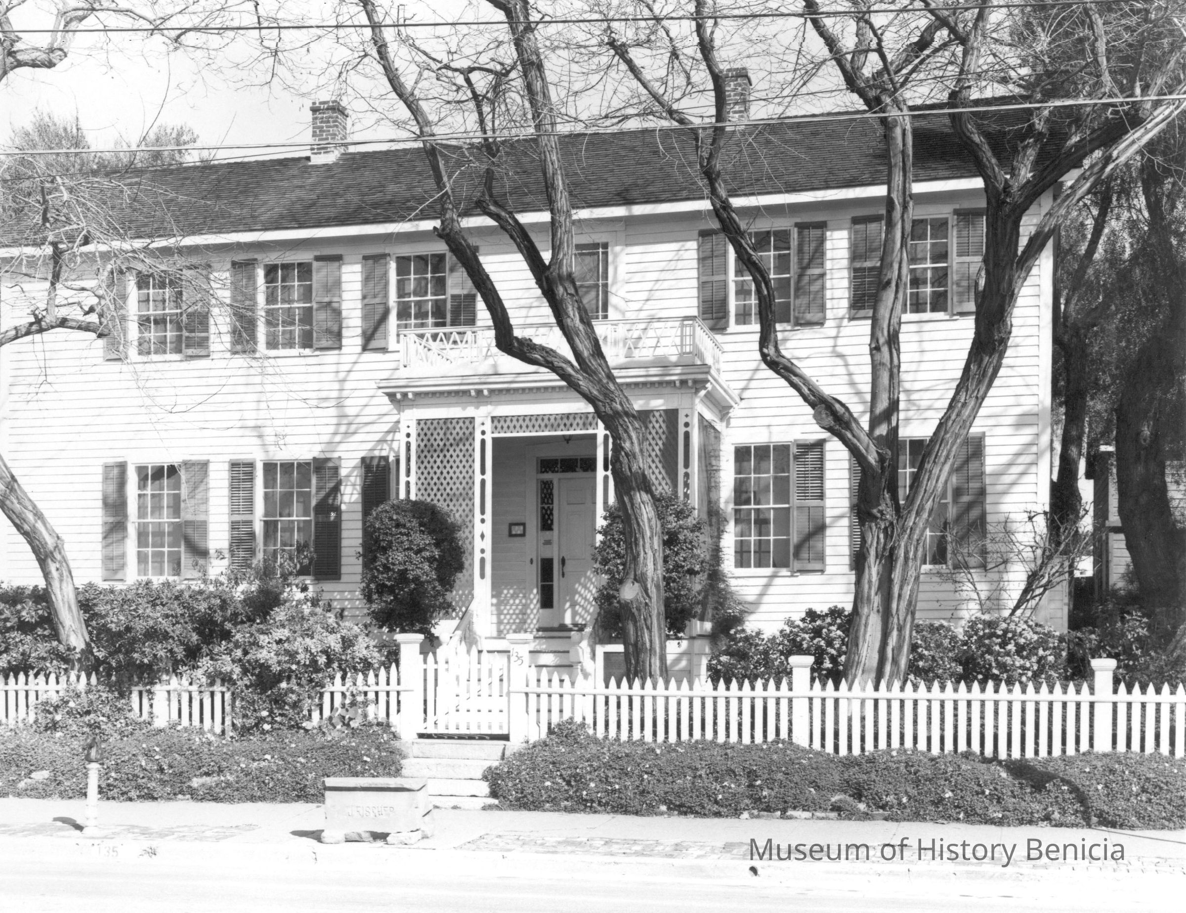 B/W photograph originally under glass in a black frame with gold trim. The photograph is glued to a mat board It is of the Fischer-Hanlon house. The caption reads: "The above charming residence was once a hotel on First Street. in 1856 it was purchased by a swiss-born Benicia merchant, Joseph Fischer, and was moved to its present location next to the early capitol, with additions and renovation. The house was occupied by descendants of the Fischer family until 1969, when with its contents it was given to the State of California, and the Fischer residence joined the early camptol as a part of the California State Historical Park."Collection