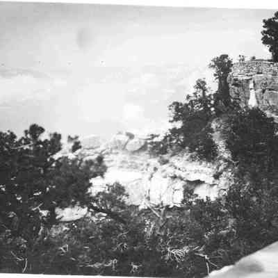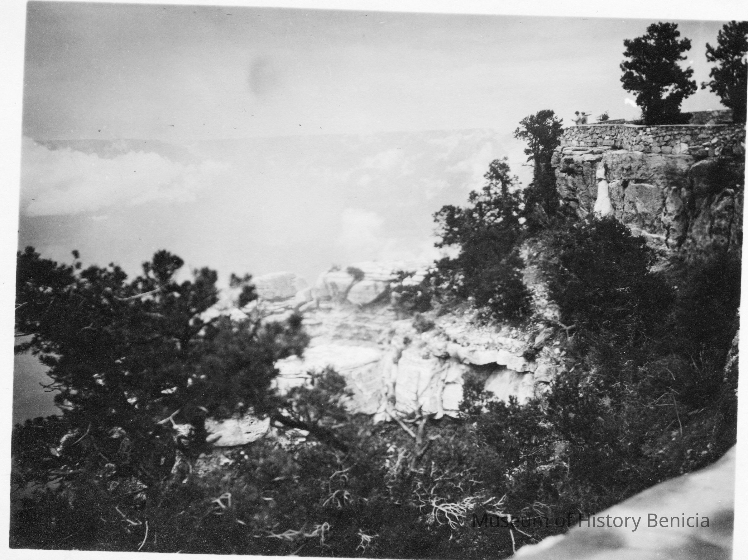 Photo of trees and cliffs. There is a lookout pullover point on the right side of the picture.