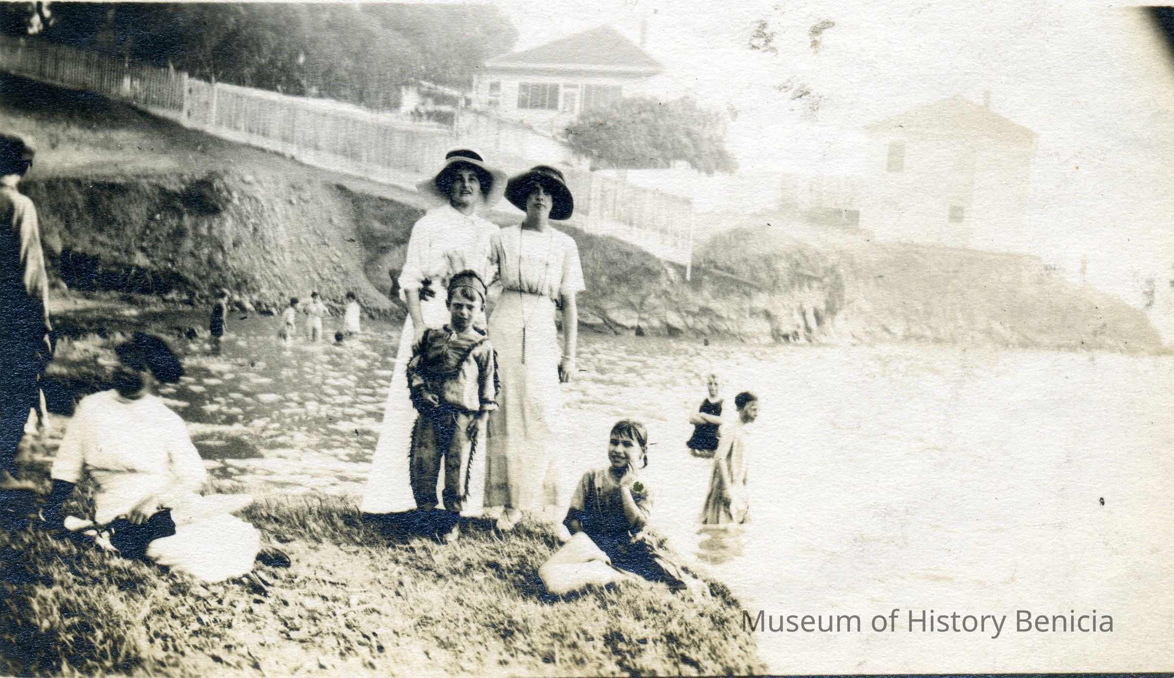 Photo of a group of people swimming on Barlotti's beach in Benicia. This is the original from which photos 2014.011.0162 and 161 were made. Taken sometime in the early 1900's.Collection