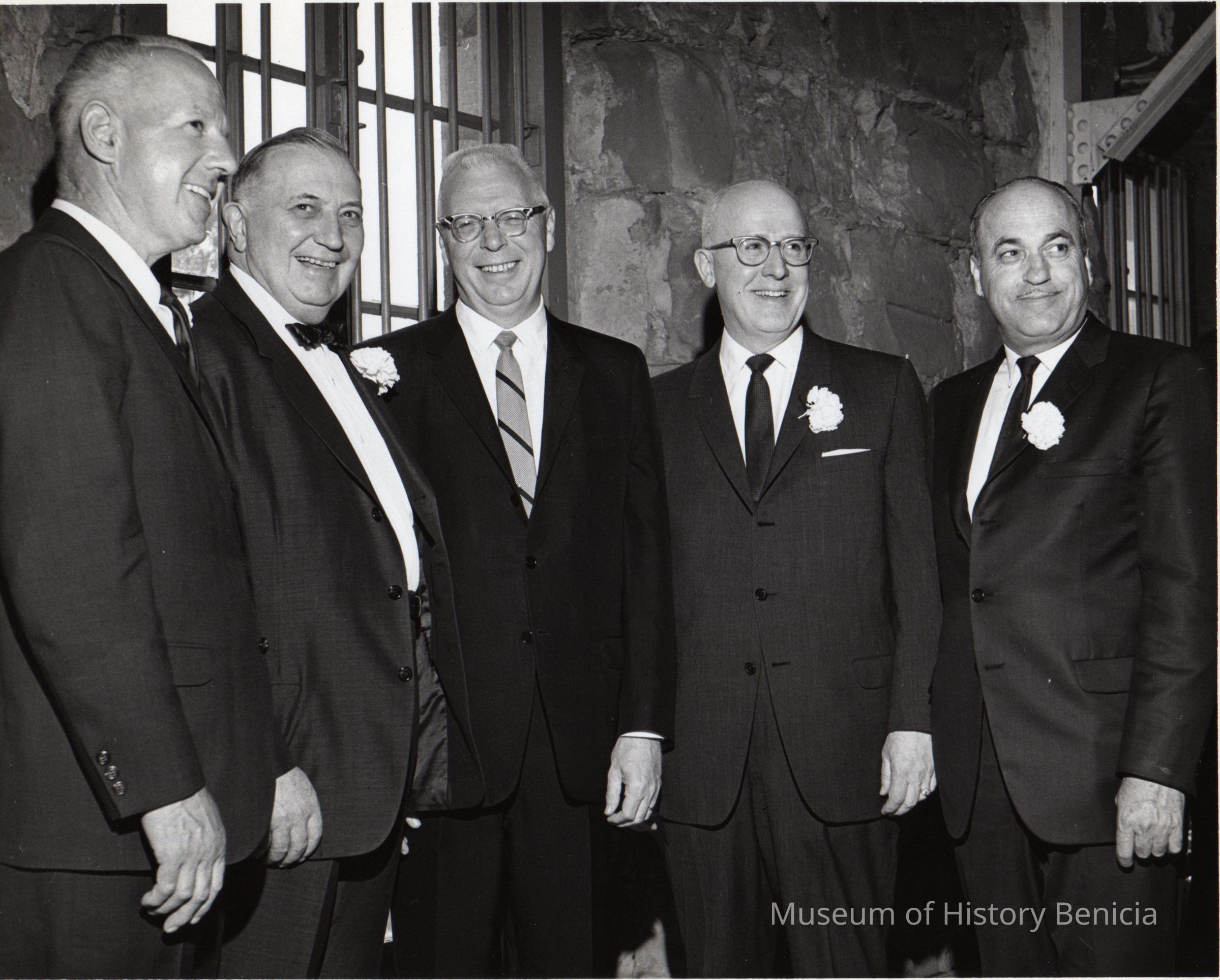 B/W Photograph: Five men pose inside the Clock Tower (one on the far right is James Lemos)