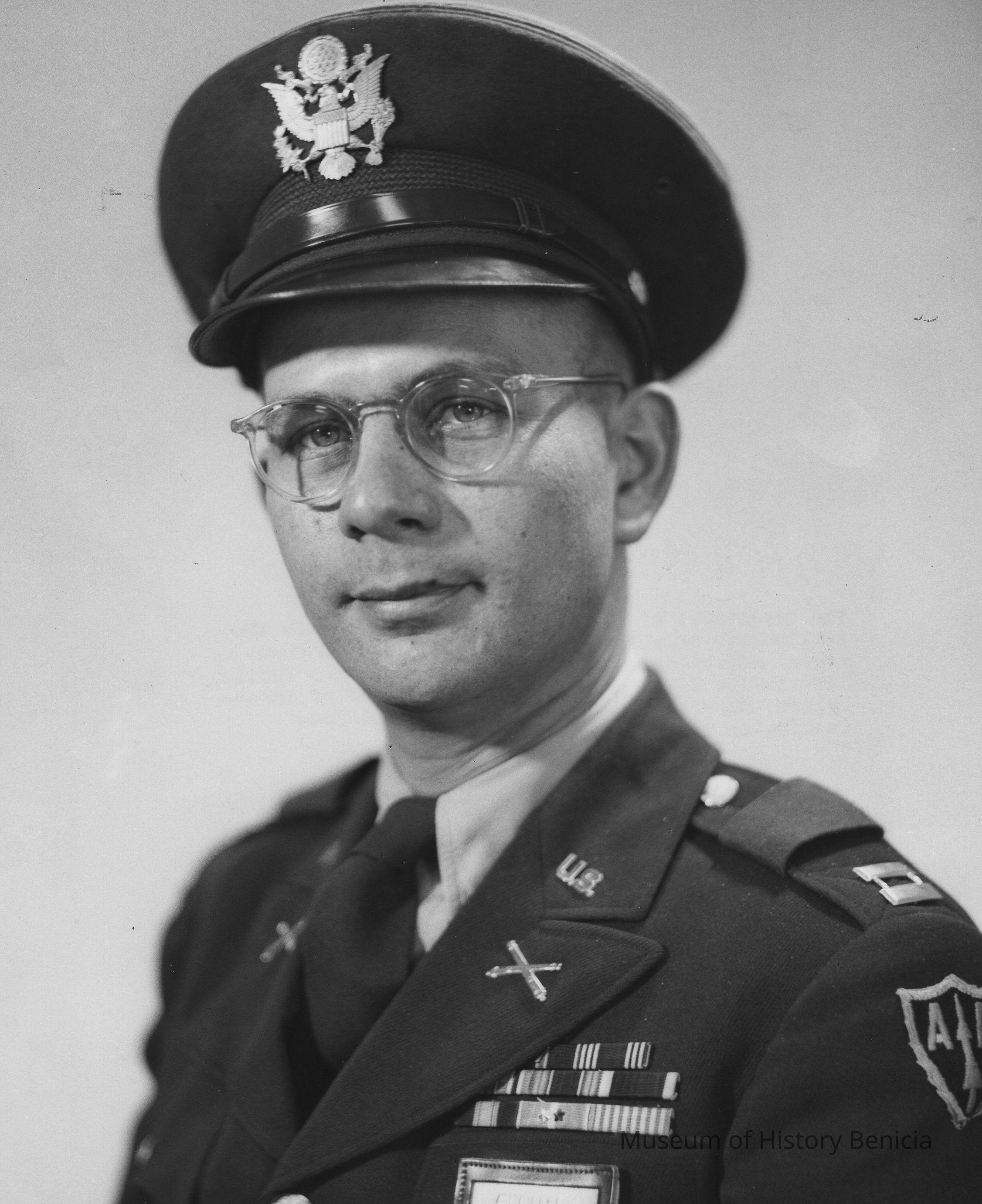 B/W Photograph: head and shoulders shot of man wearing glasses, an army uniform and a brimmed cap. On back: U.S. Army photo stamp and "04071-337-1/AM-56".