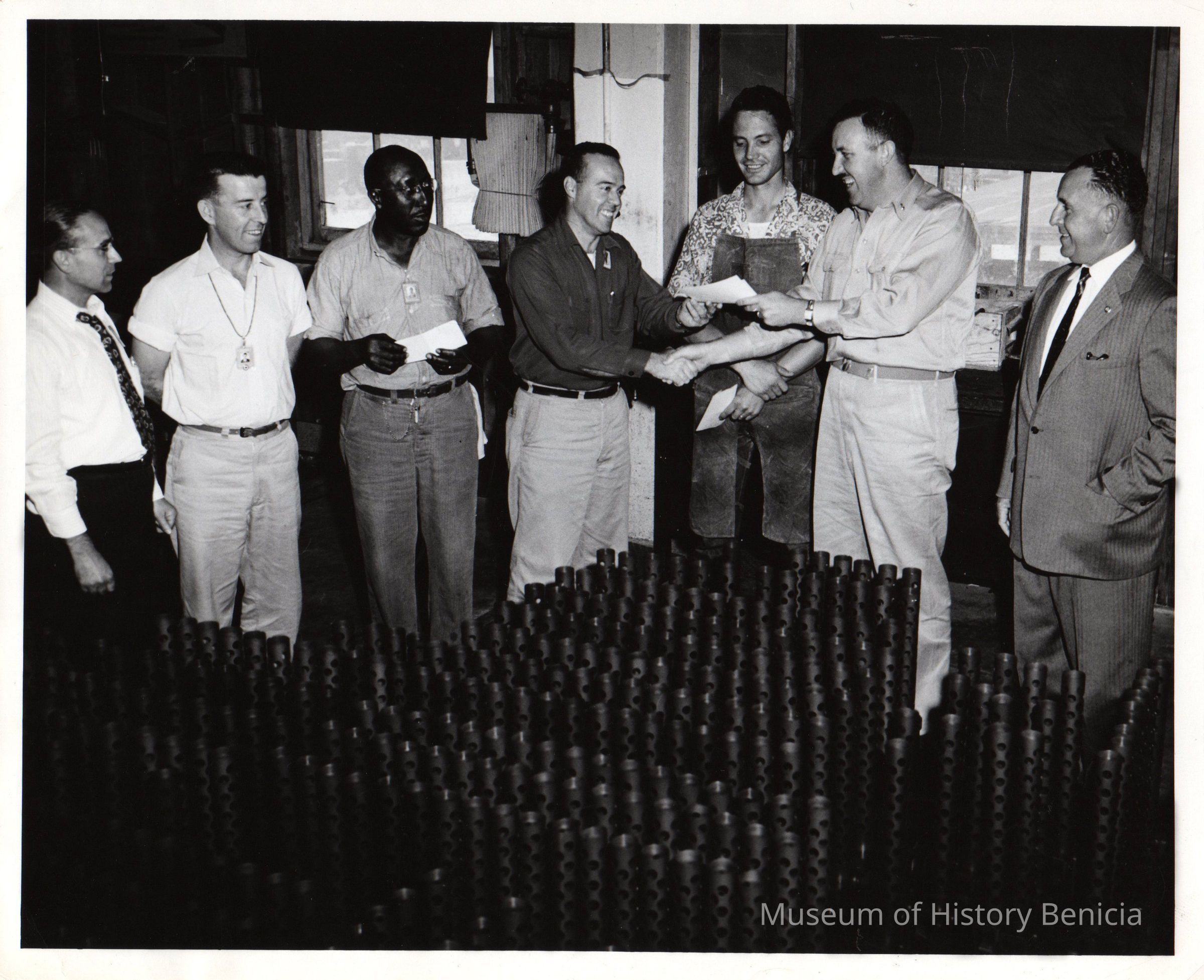B/W Photograph: awards being presented. Seven men standing behind cooling tubes for heavy machine guns. On back: "George Alves" on far right side in ink, "Henry K. White on far left side in ink, and U.S. Army stamp.Collection
