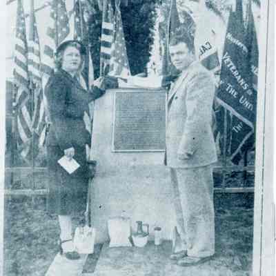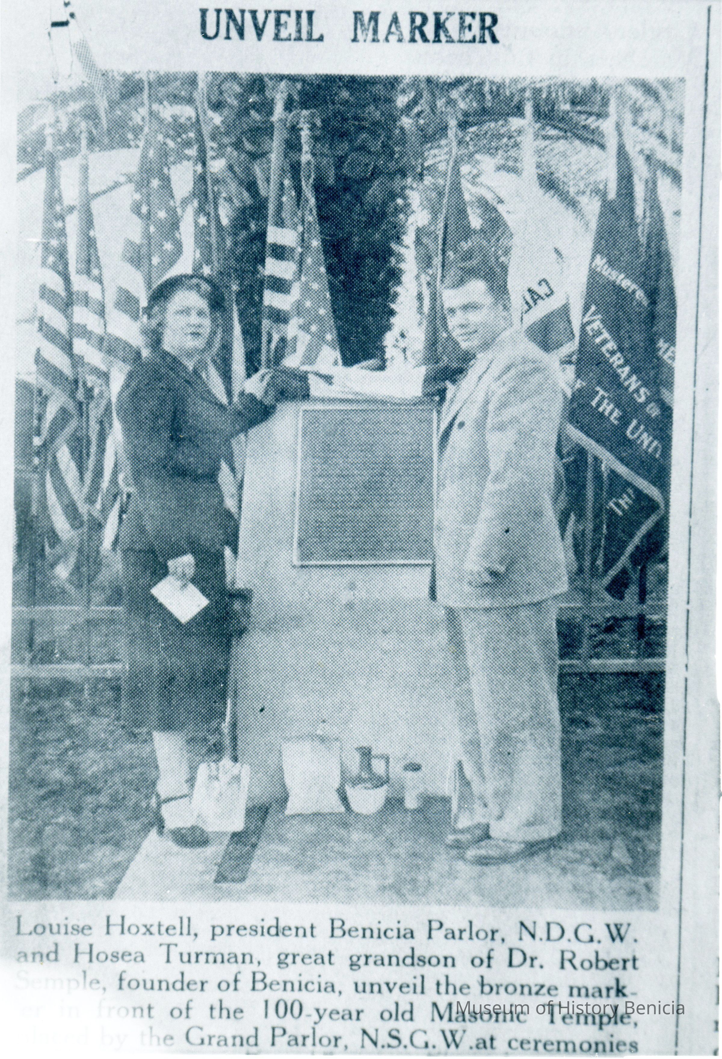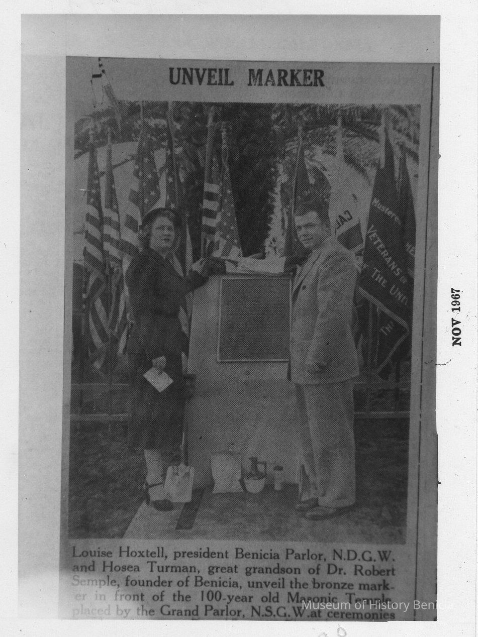 B/W photograph of a photograph: title above photograph: "Unveil Marker". caption below photograph: "Louise Hoxtell, president Benicia Parlor, NDGW and Hosea Turman, great grandson of Dr. Robert Semple, founder of Benicia, unveil the bronze marker in front of the 100-year old Masonic Temple, placed by the Grand Parlor, NSGW at ceremonies....." (rest is not visible in the photograph) (see 1984.001.0007-39c)Collection