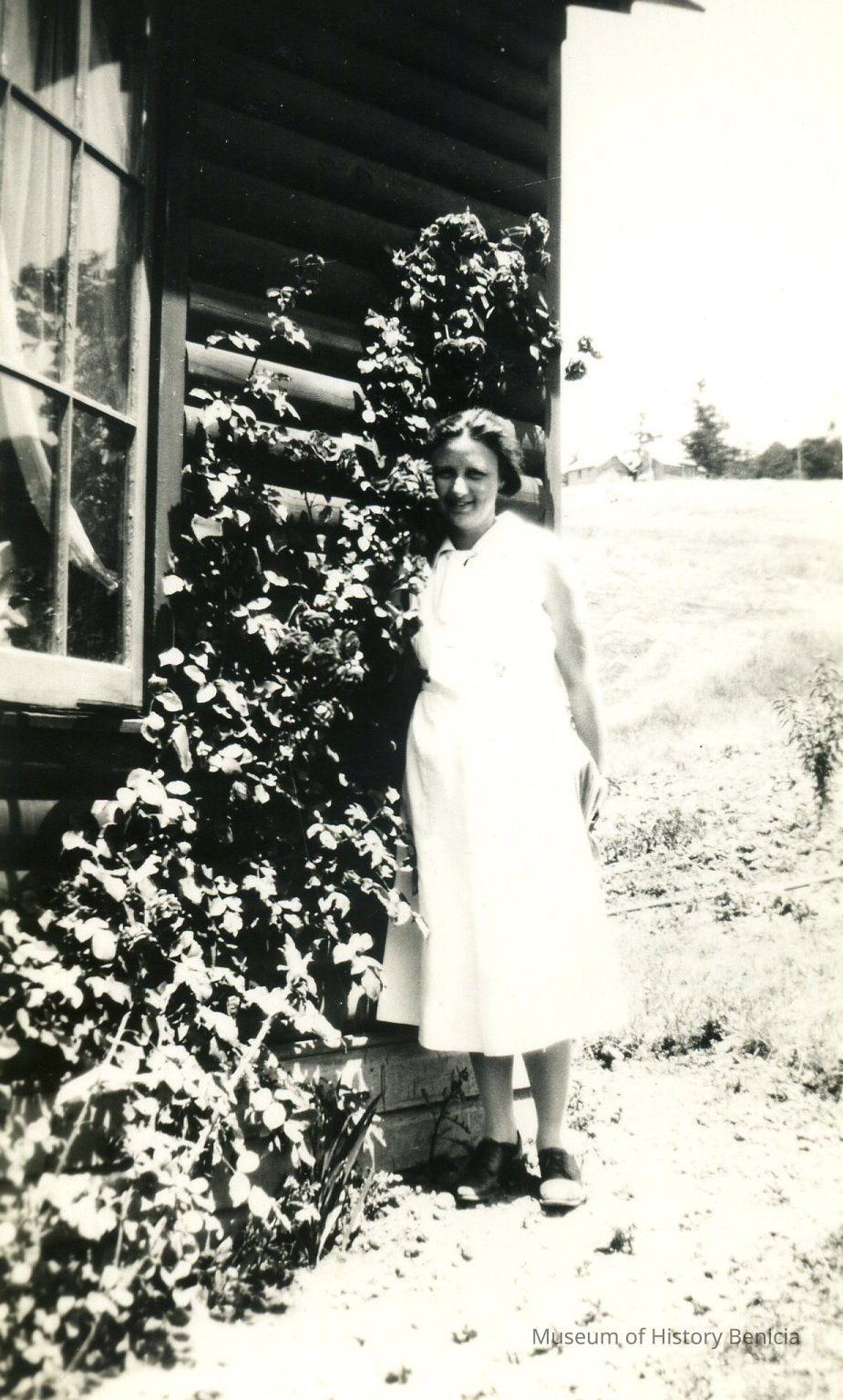 B/W Photograph - Unidentified young woman standing next to a log cabin-look house in an unknown location 3" x 4-3/4";