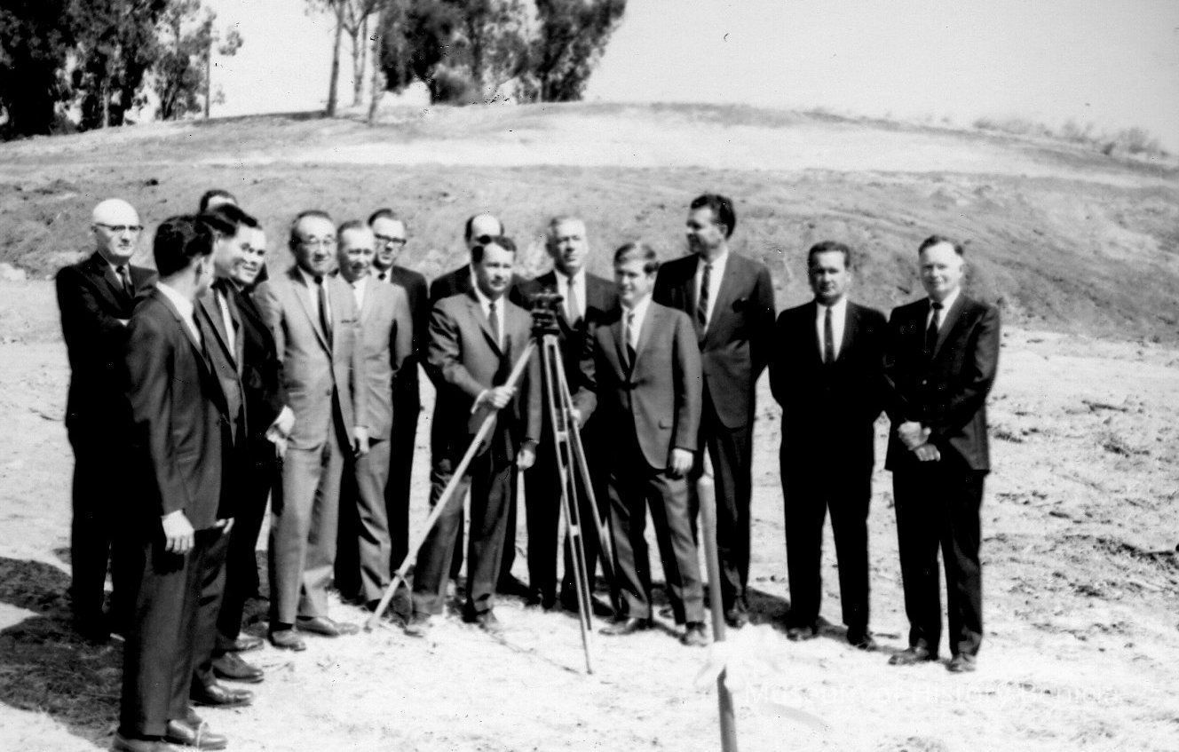B/W photo of Solano Square area just before construction began. Fifteen men in suits are standing behind a surveyors tripod. (see also 2000.100.0024)Collection