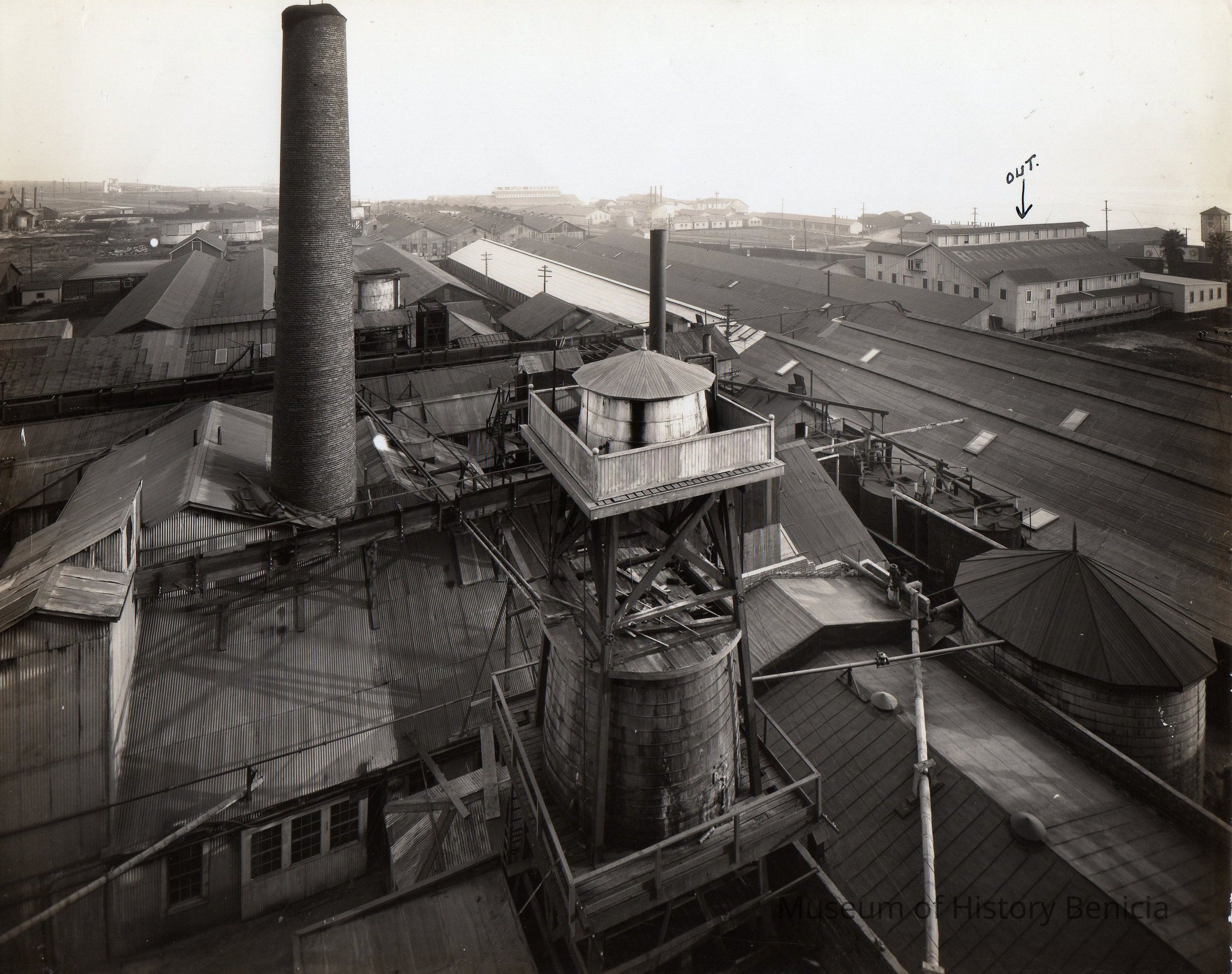 Black and white overview of Benicia Tannery looking east.