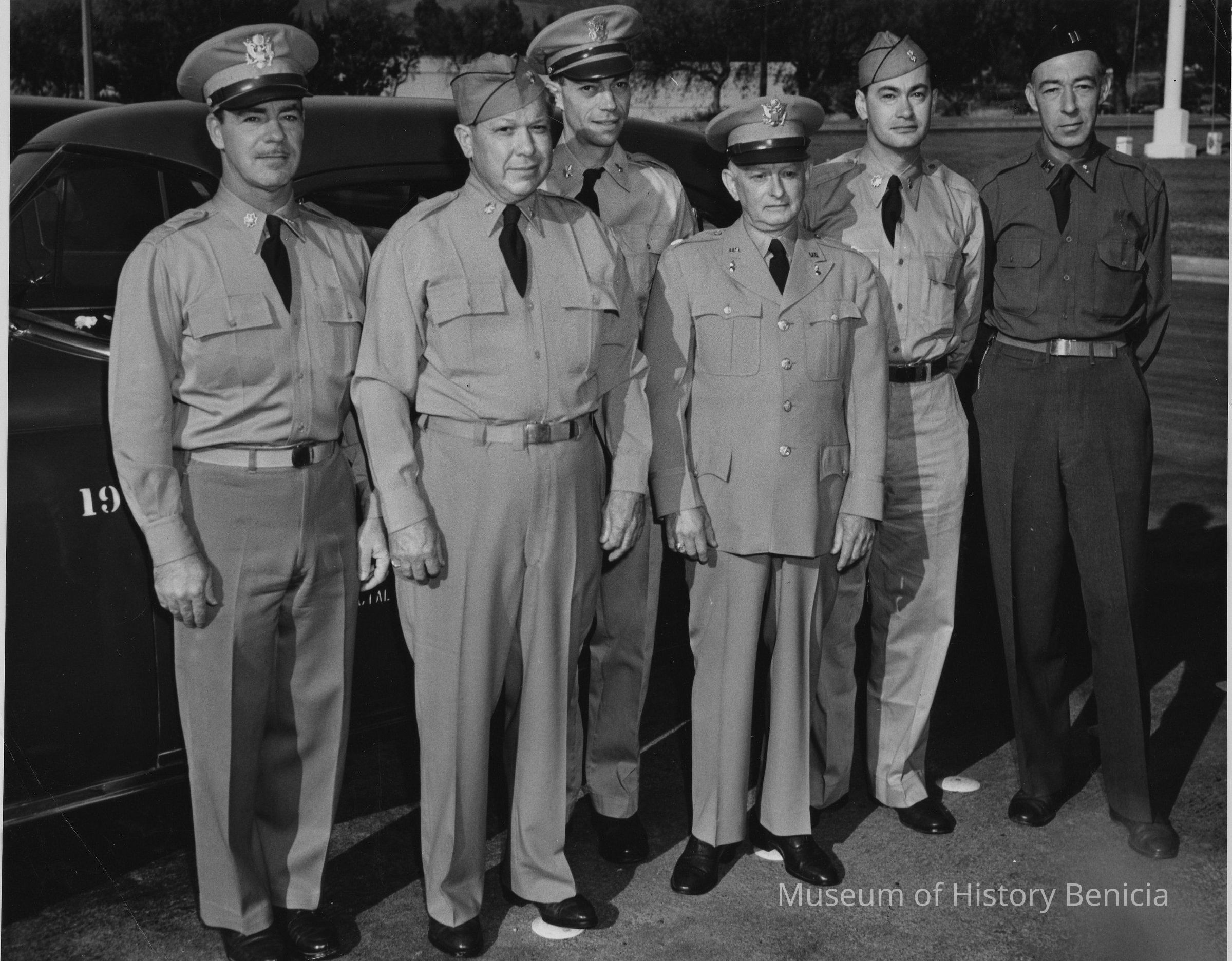 B/W photograph: Six men in uniform standing by a car. "04070-220-1/AM-53" and U.S. Army photo stamp on back, and "Arsenal Reserves" is written on the back in pencil.Collection