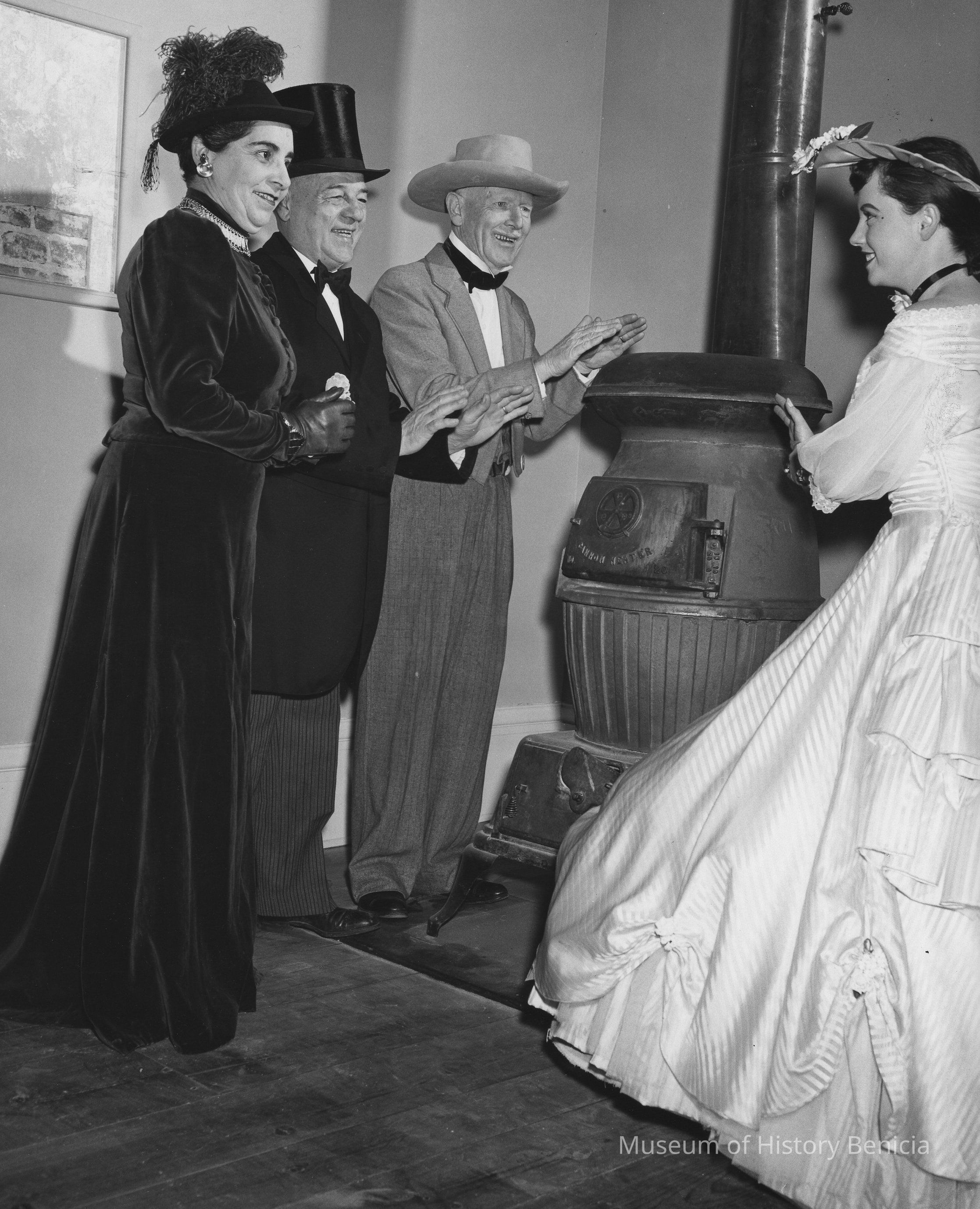B/w photograph of two men and two women in 19th century period clothing, warming their hands around a potbelly stove. The Lenoir Miller Collection. From Left: Mrs. George Lawrence of Vallejo in period costume that might well have graced the wife of a Senator of the 1850's, Governor's Ball Chairman Frank Passalacqua, Celebrations vice-chairman Arthur C. Arneson, dressed in the costume of a Spanish delegate of mid 19th century. On the Right: Junior Hostess Norma Sharon, also in period costume. The photo was taken in the Assembly chamber of the Old State Capitol Building in preparation for the dedication March 14 + 15, 1958.