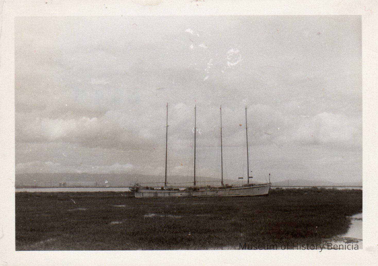 B/W photograph of a four masted ship on the water