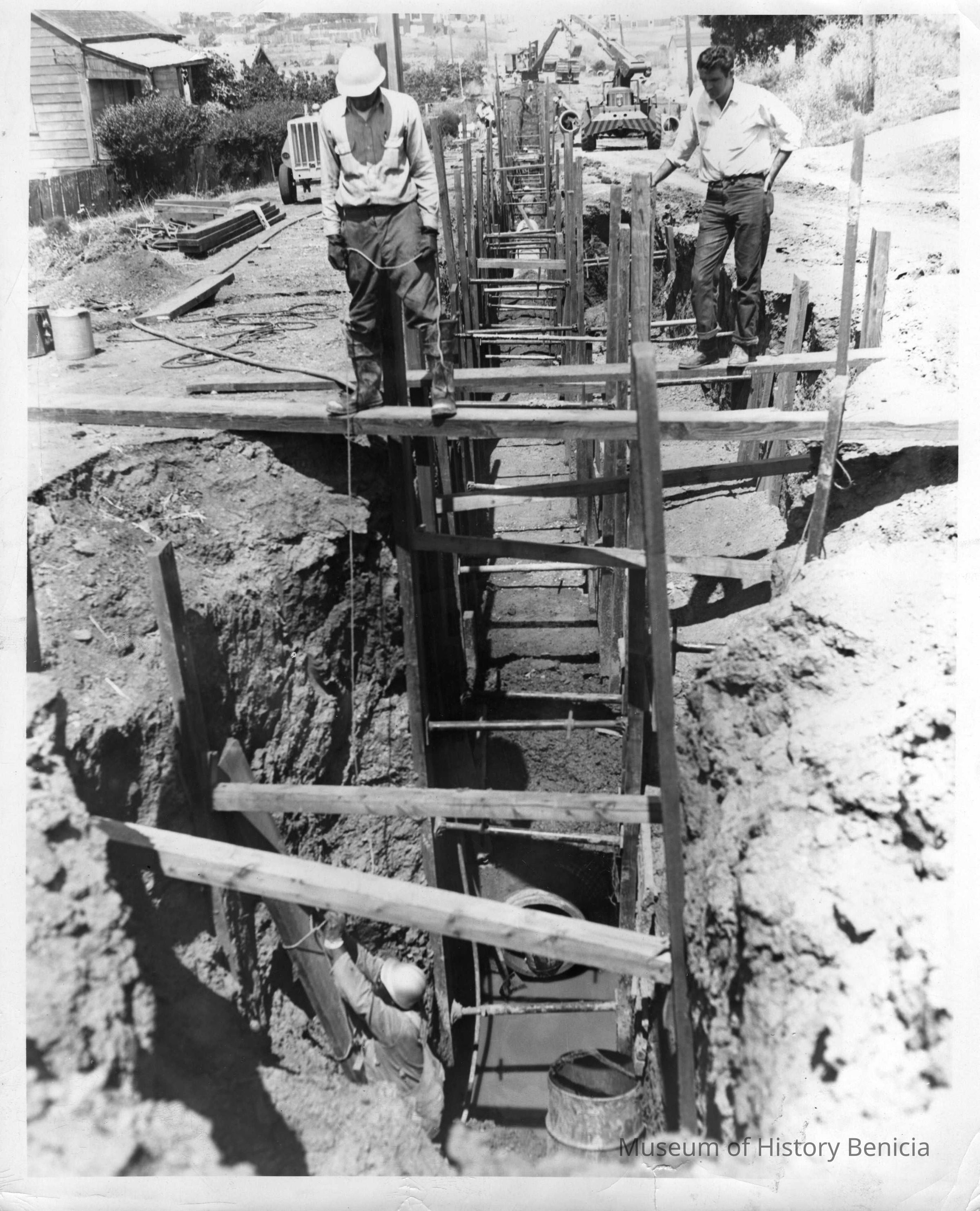 Photo of men working on what looks to be the sewer. Large trench dug into ground, supported with scaffolding. Tractors in the background. Two men featured.Collection