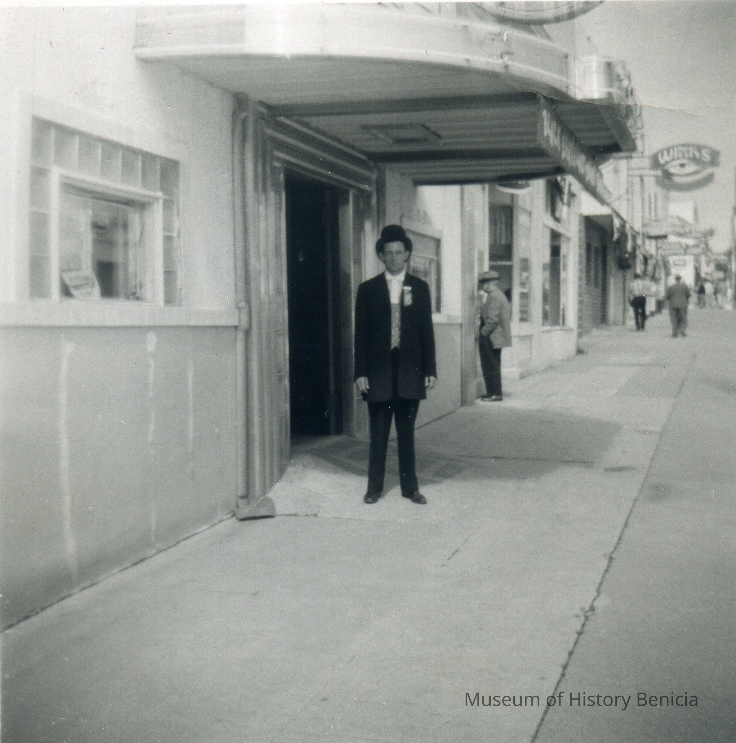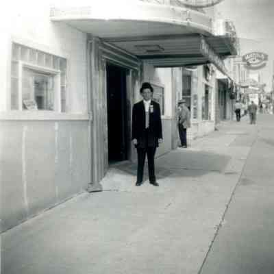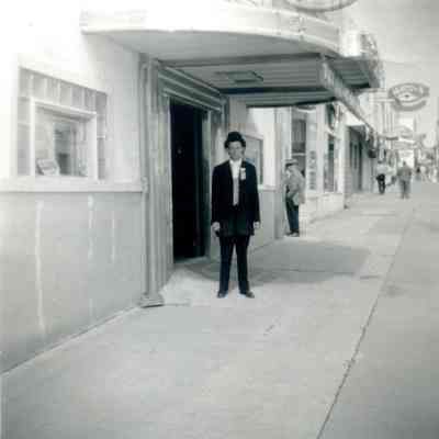 B/W photograph: Man in dark suit in front of 615 Club (bar)--identified as Urban Braito by Harry Wassmann. Winks bar is in the background.Collection