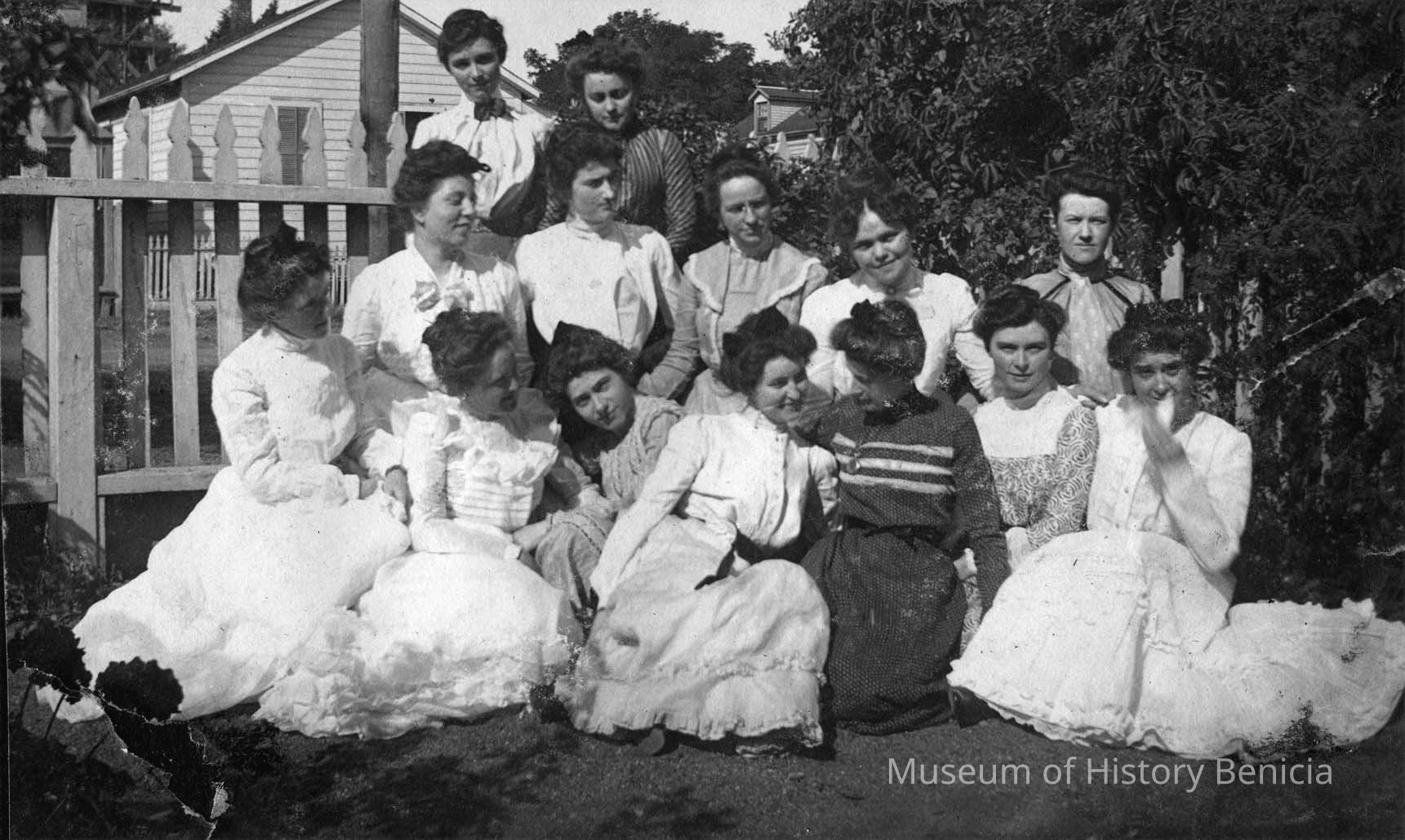 Photo from album page. Fourteen girls standing and sitting in a garden. Caption reads, "At Ettie Reuger's 1900".