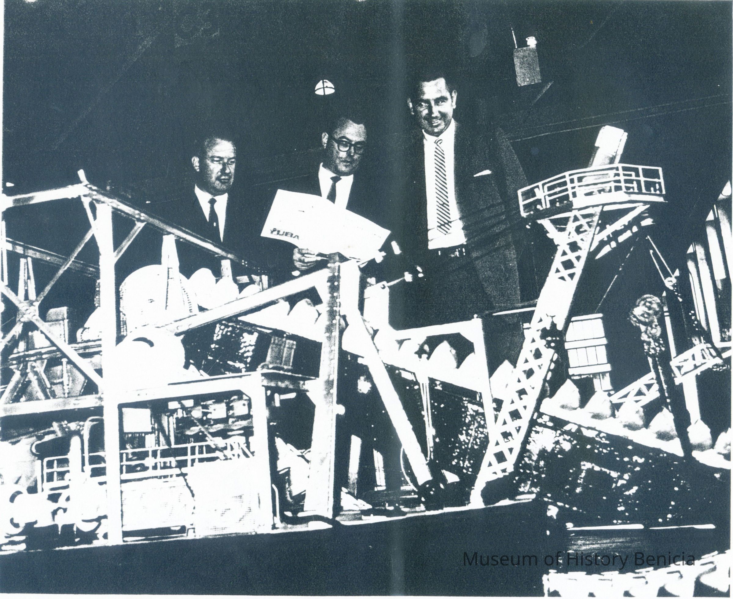 Black and white photo of gold dredge model. Leon Bates, center, Floyd Voecks, left, Lloyd Riggs, right.