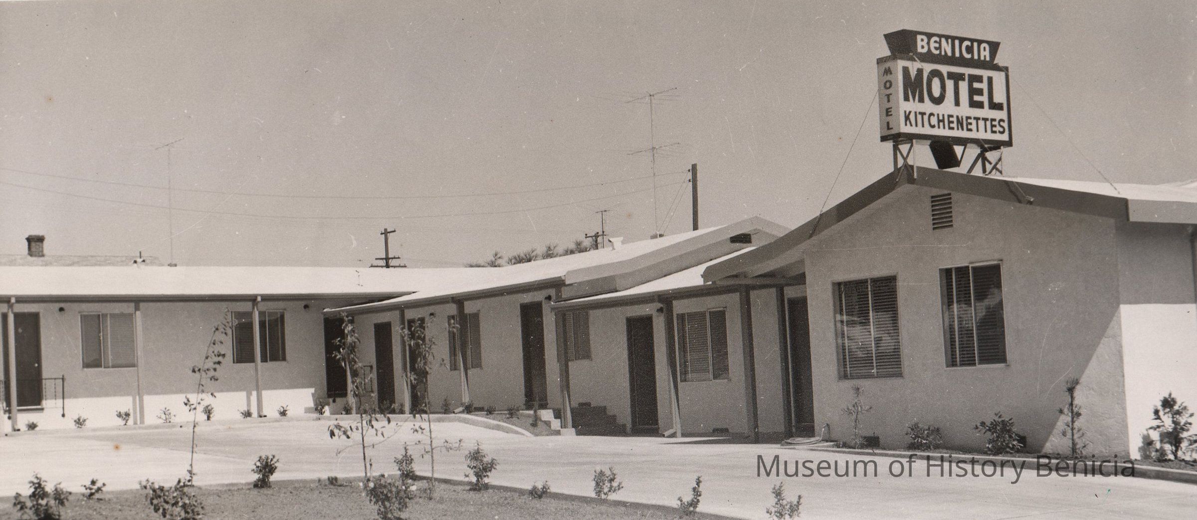 B/W Photograph: Benicia Motel at the corner of East Fifth and H Streets.