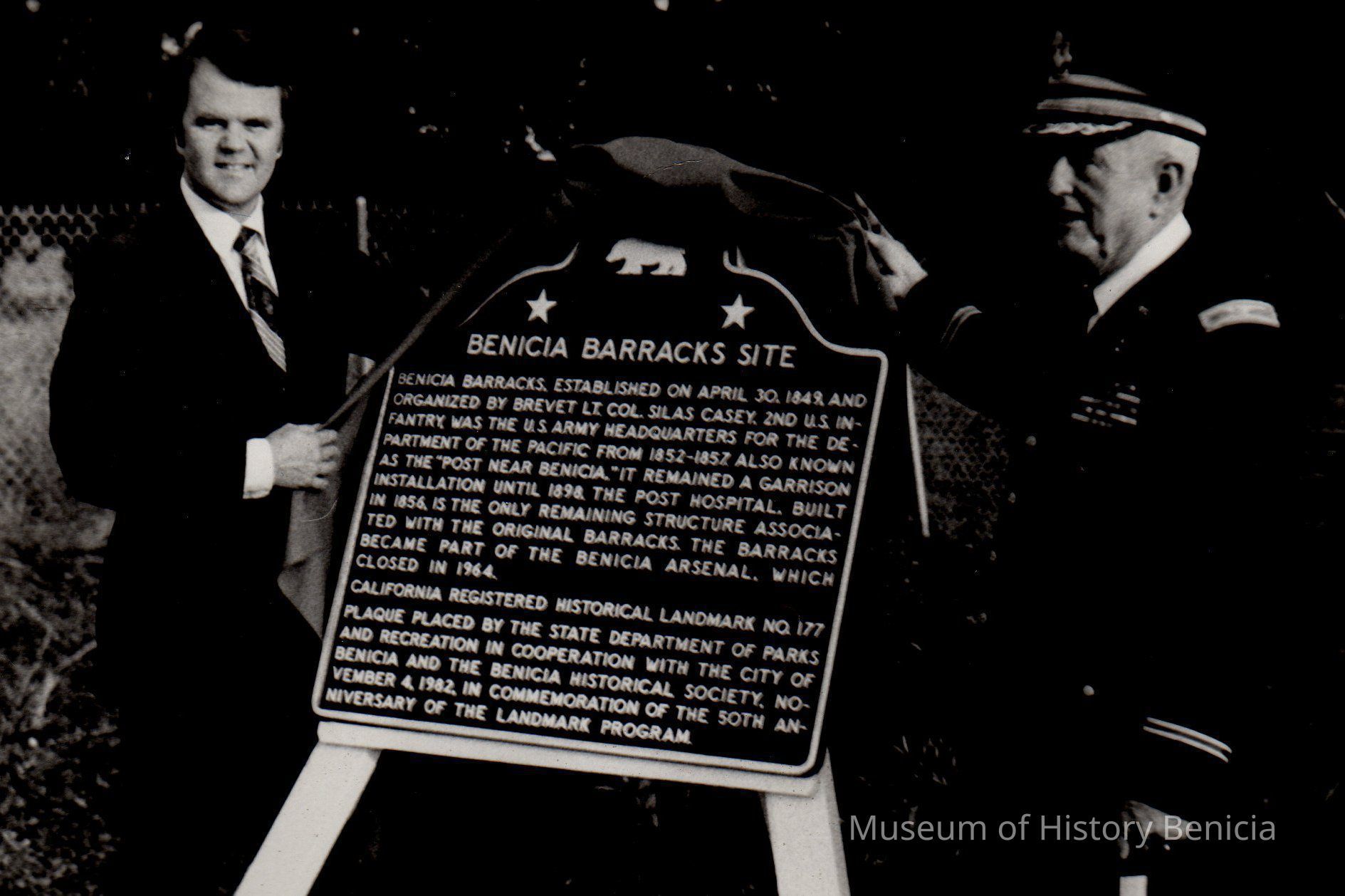 B/W photo of Benicia Barracks historical plaque being unveiled by Warren O'Blennis (left) and unidentified man in uniform at right. Stamp on back: "V. I. P. Photo by Ray Blaich."Collection