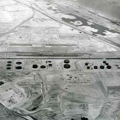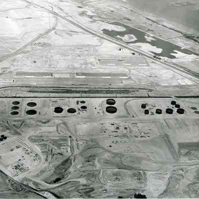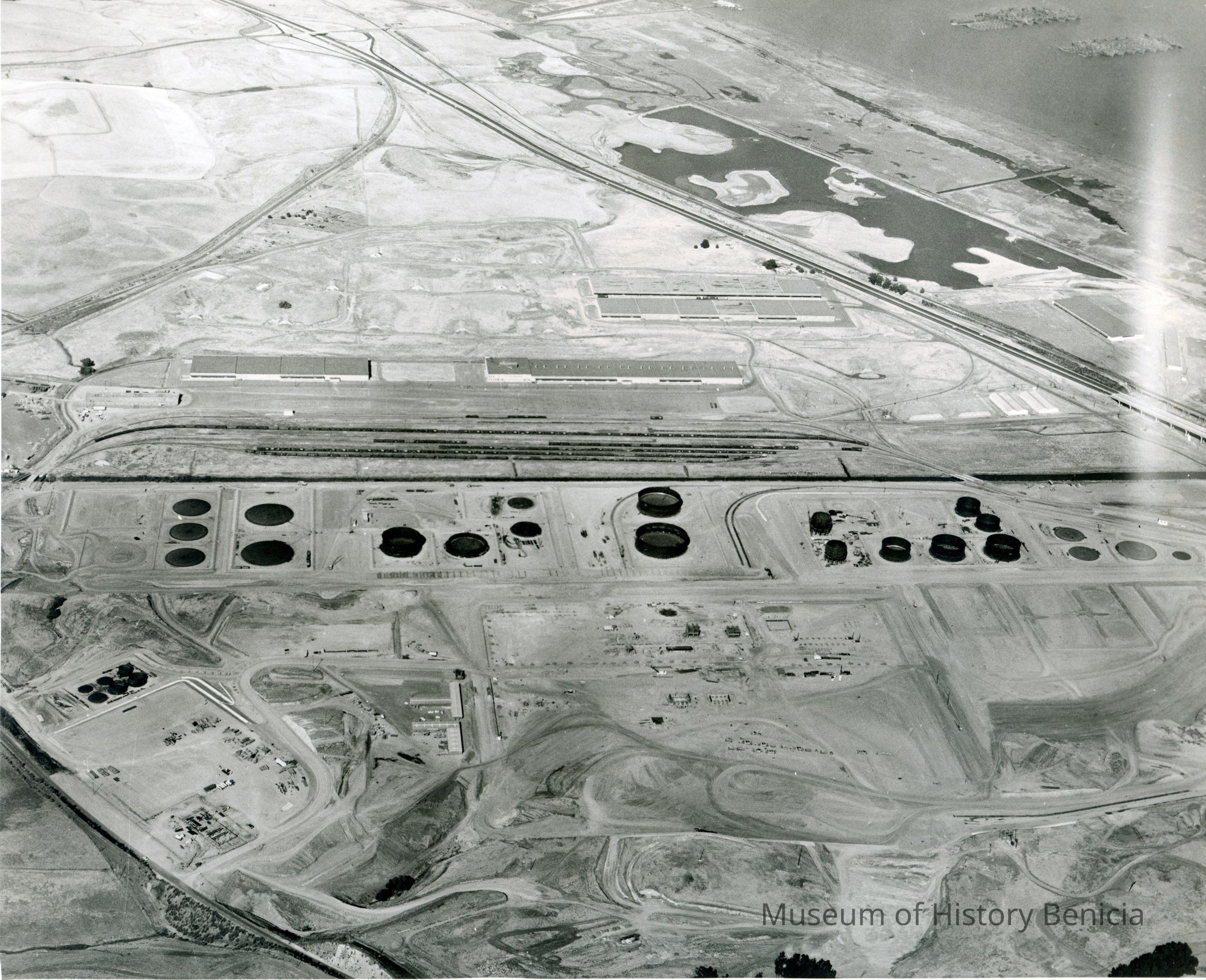 looking north; upper right corner: marsh and some ships of the Suisun Reserve Fleet; across the center: 28 storage tanks in various stages of construction; at lower right: grading and construction roads are visible; upper center: warehouses and train cars on sidings can be seen; hiway 680 is visible going from mid-right to upper left in photo.Collection
