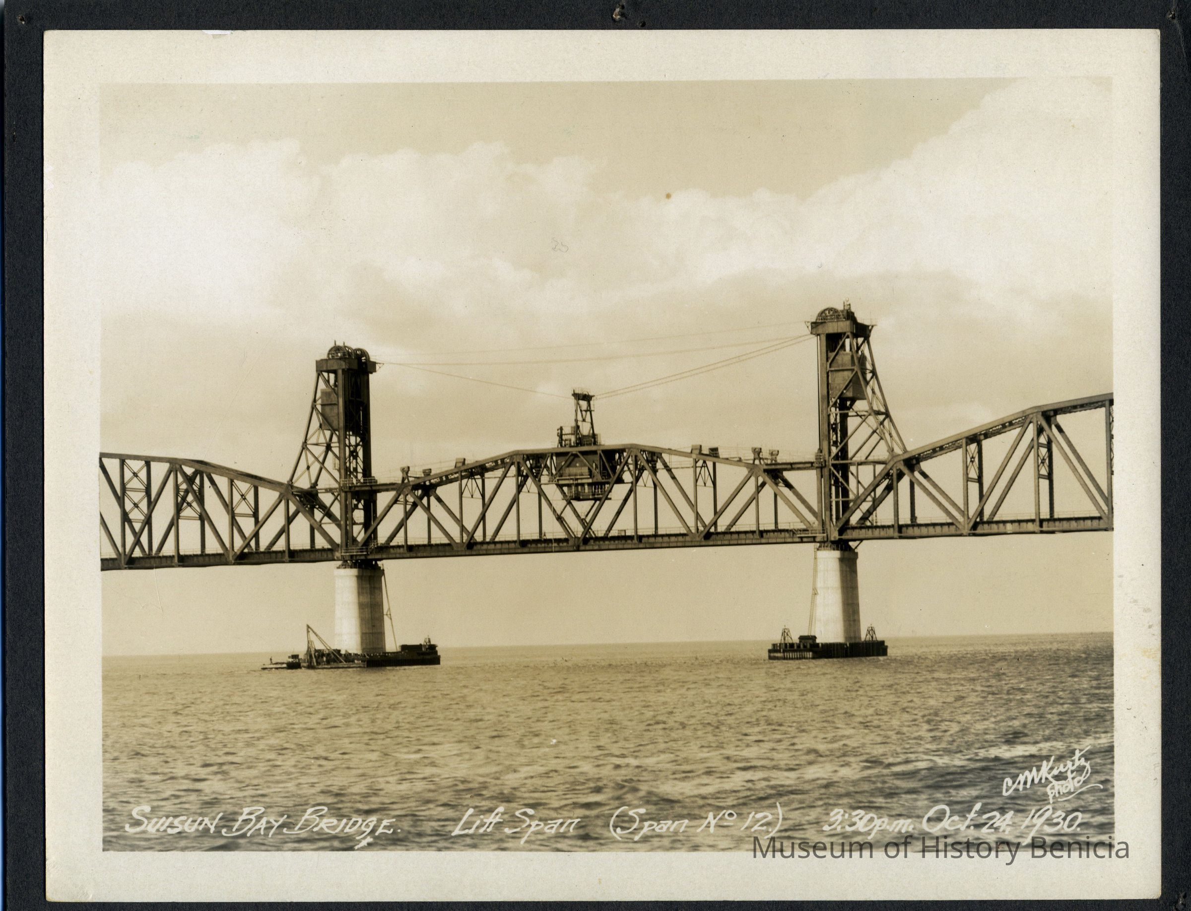 Benicia/Martinez Bridge lift span (Span No 12) @ 3:30 PM. B/W photo.