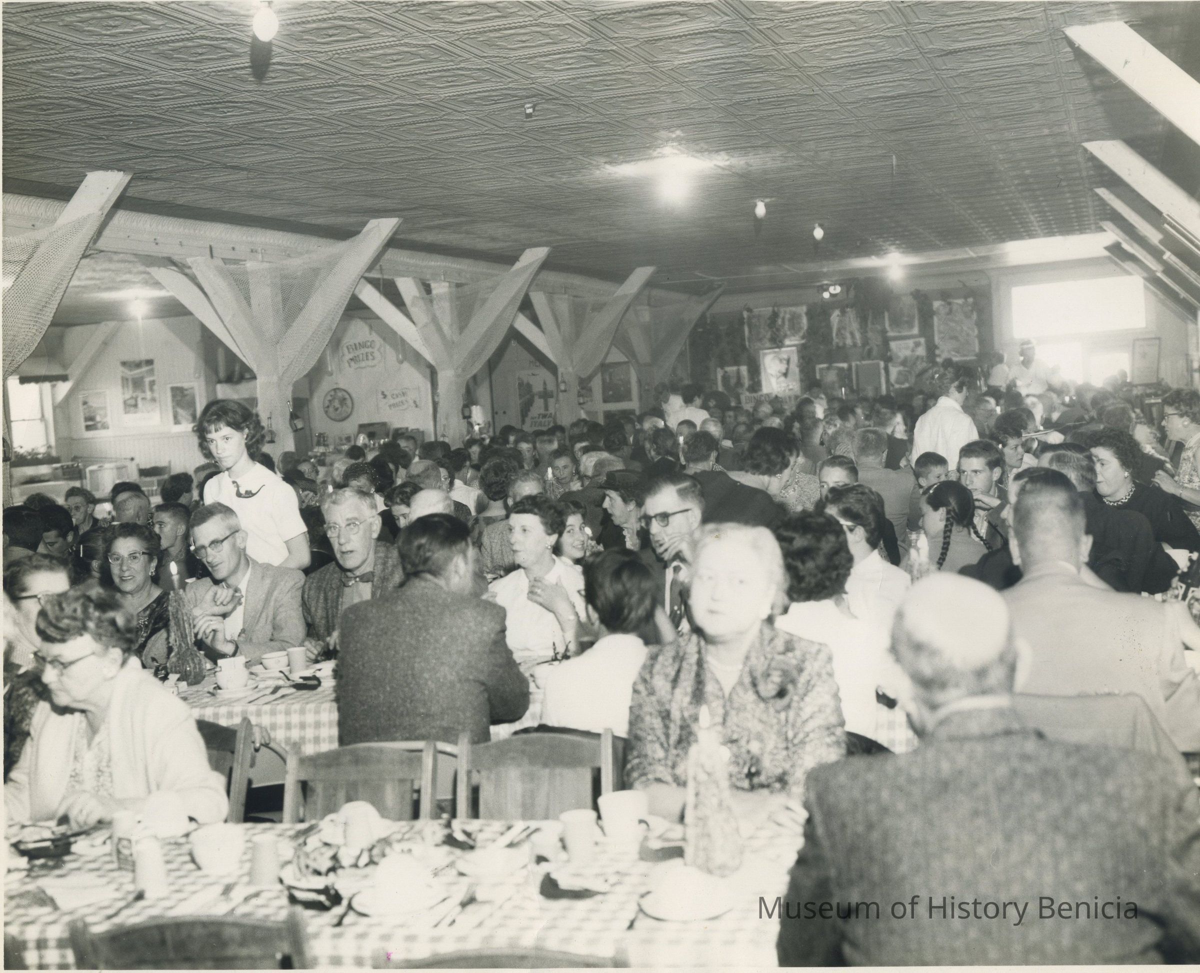It is a photograph taken by a Benicia Herald Photographer (photo no. 1820) of a community event. The location has been identified as the downstairs area of the Portuguese Hall on West J Street. The occasion of the dinner is unknown. It is believed to have taken place in 1960 or 1961.