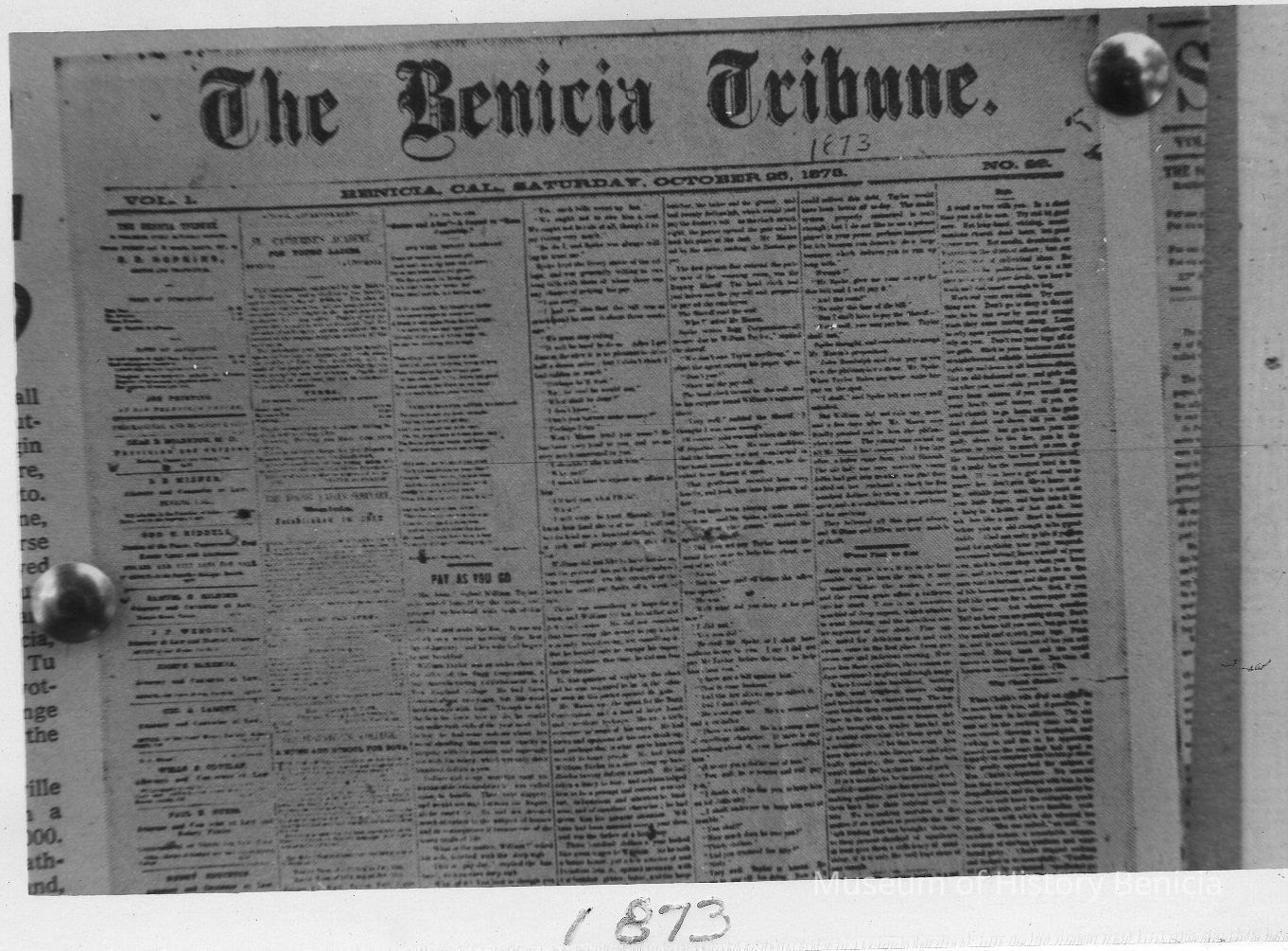 B/W photograph of a photograph (note thumb tacks): newspaper, The Benicia Tribune 1873, reprinted in 1958
