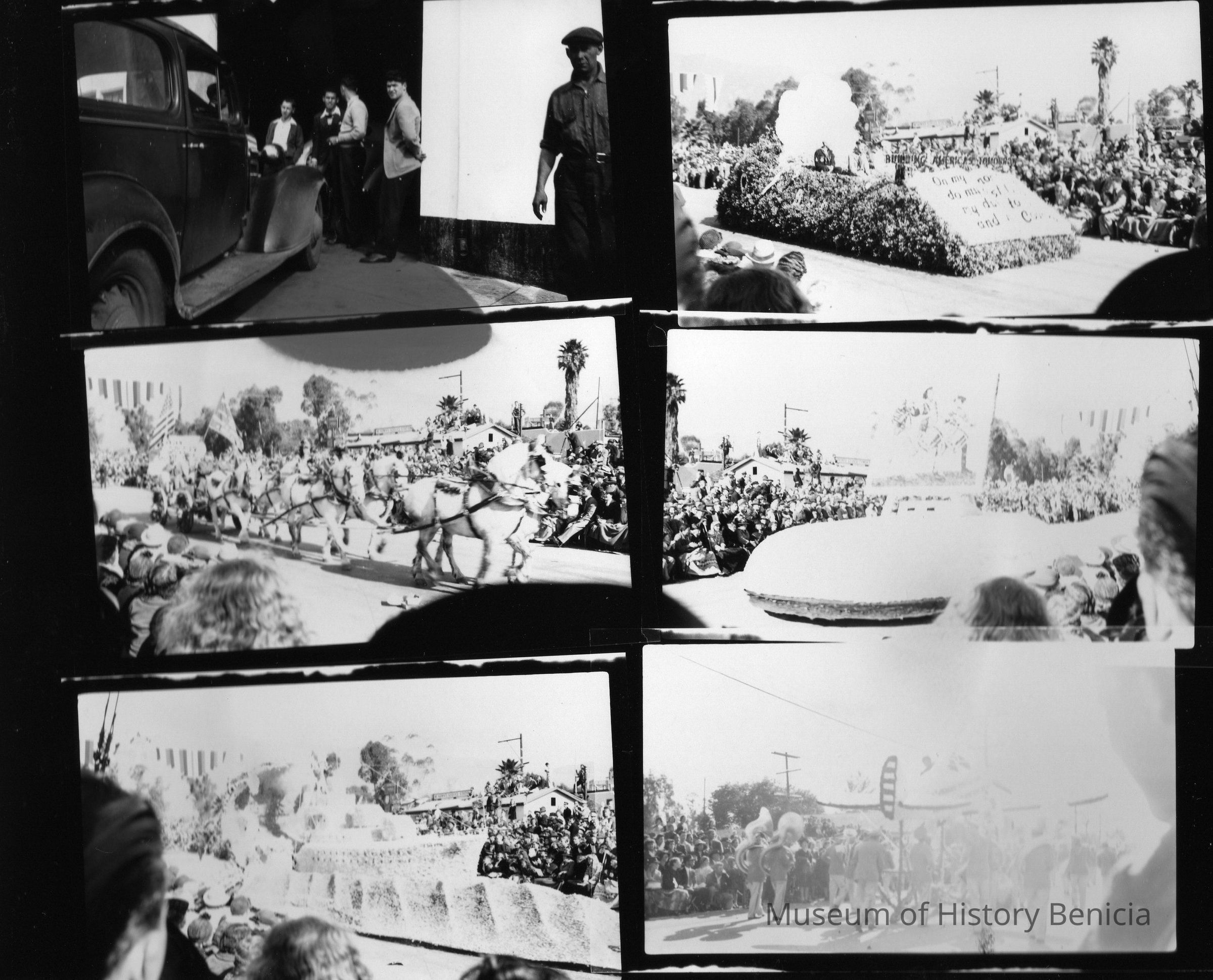 an envelope holding the negatives for this print indicated the individuals by the automobile might be from Benicia but the locale of the parade is unknown. from the Dana EstateCollection