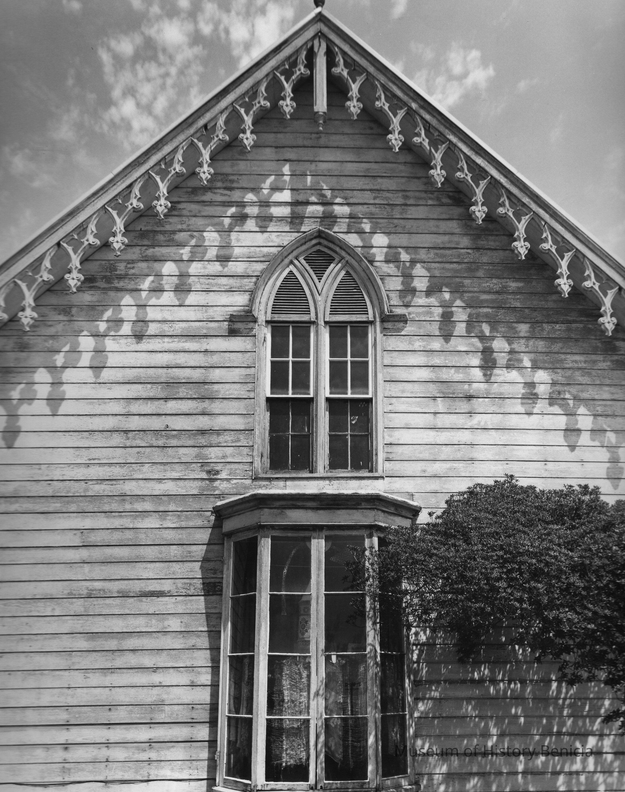 B/W photo of gable side of Walsh House, 1977. Photo appears as Figure 27 on page 27 of Bruegmann's book.