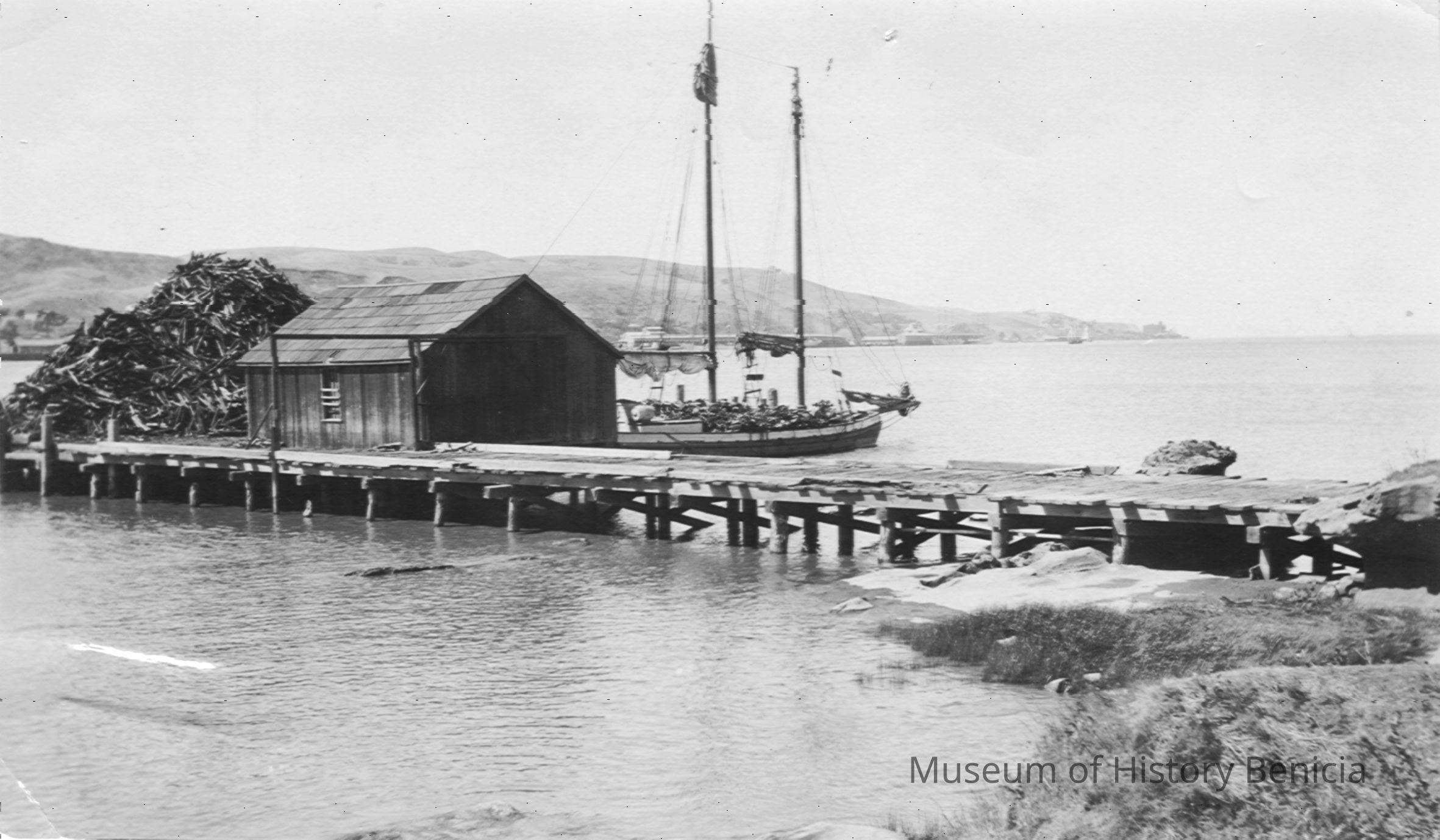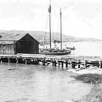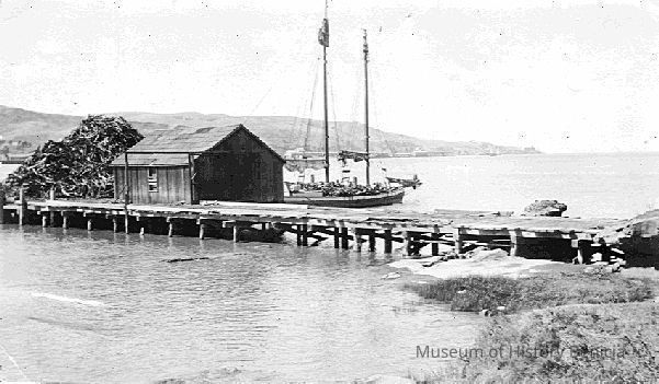 Black and white photo of McKay Tannery wharf showing sailing vessel unloading bark. Note large pile of tan bark on dock.