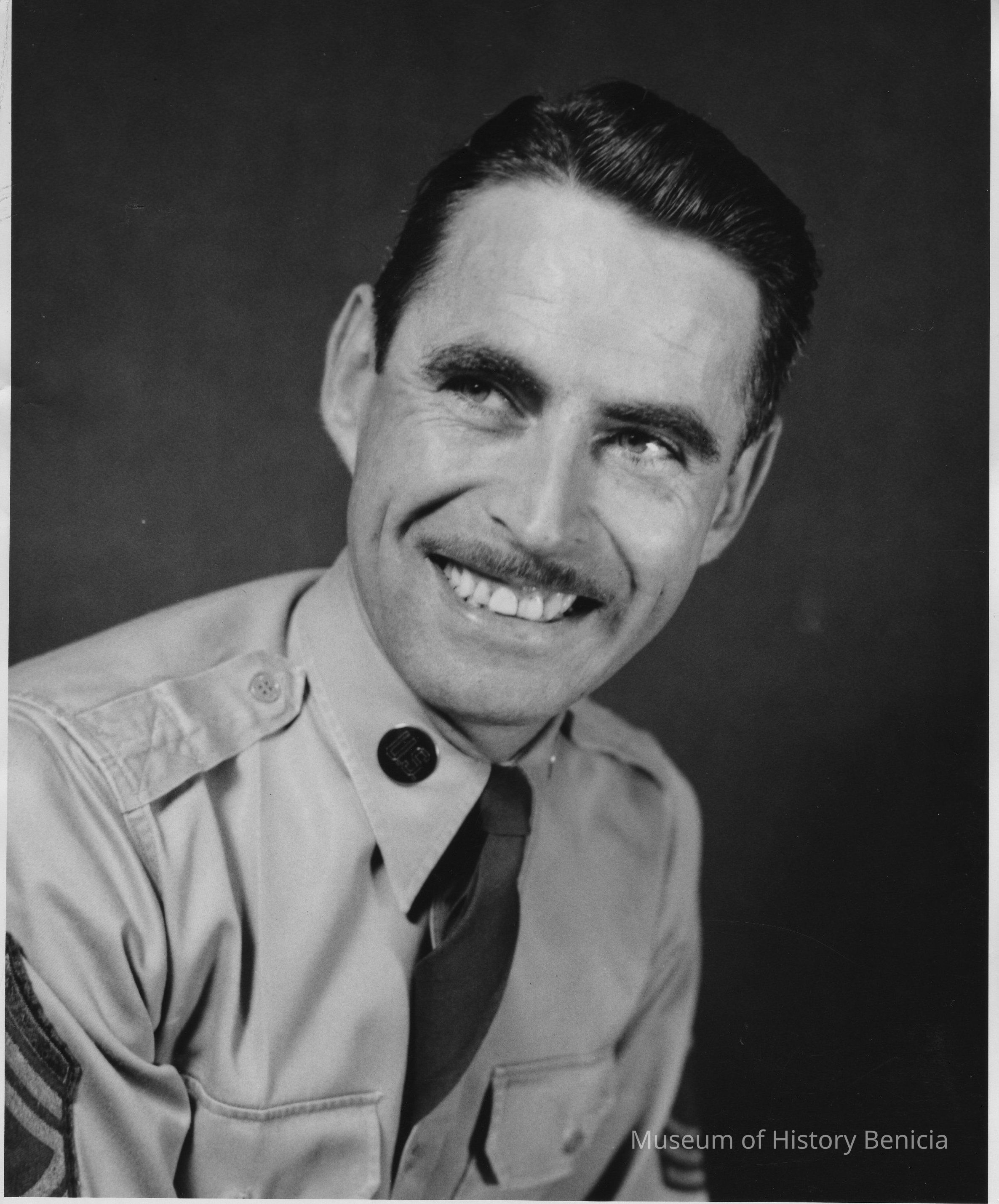 B/W Photograph: head and shoulders view of grinning, unidentified, middle aged man with dark hair and mustache, in Army uniform. U.S. Army photo stamp on back.