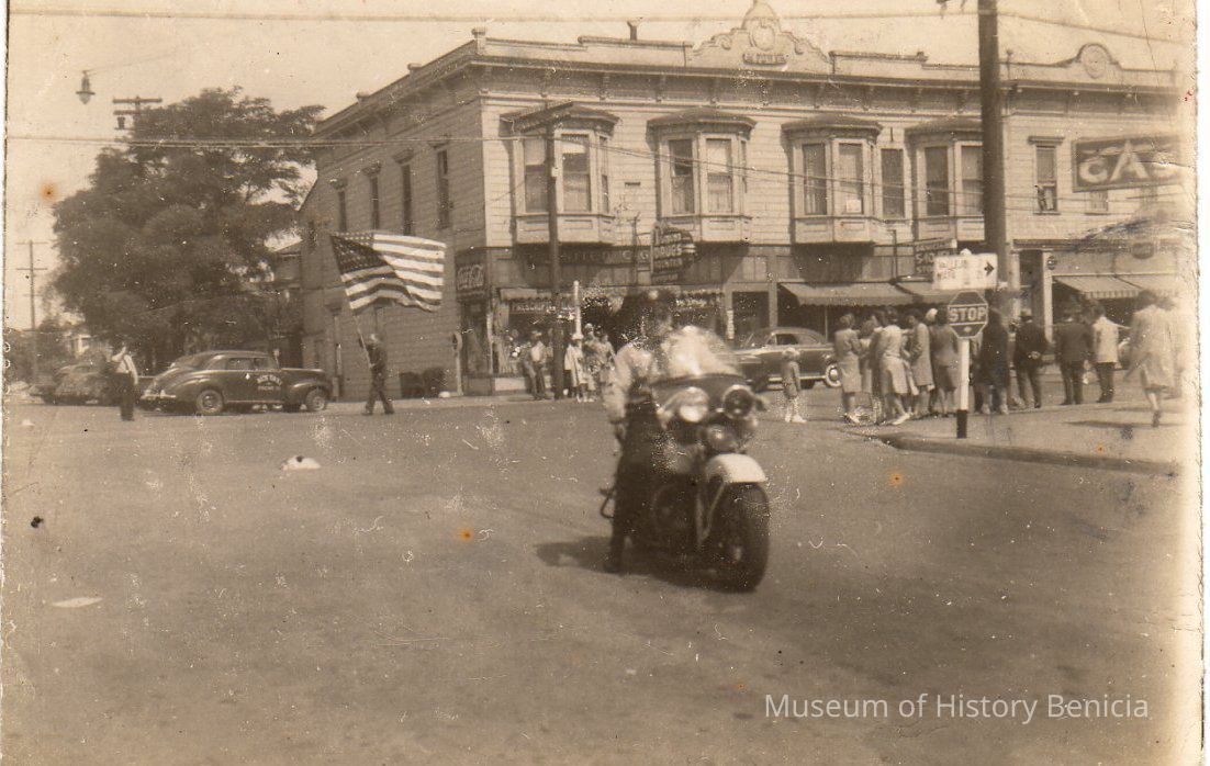 B/W photograph of police offider on motorcycle near intersection of 1st and East H Sts; late 1940's - early 1950's; parade in background with people on sidewalk watchingCollection