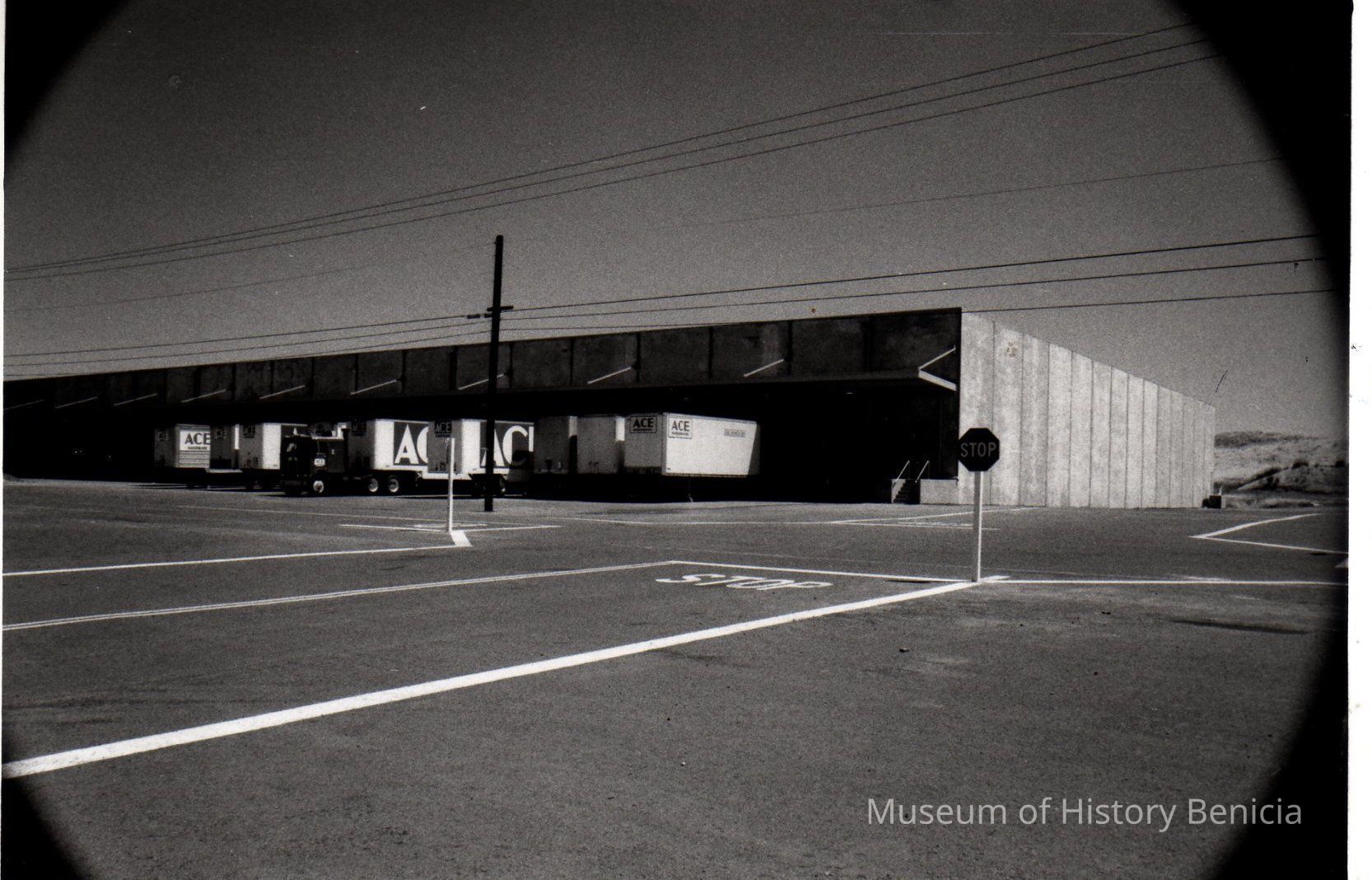 B/W photograph of Ace Hardware trucks at warehouse loading dock.